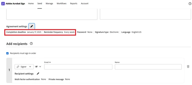 - In case a sender forgot to set reminders, or a completion deadline, they can do so after sending the agreement via the agreement properties on the Manage Page.