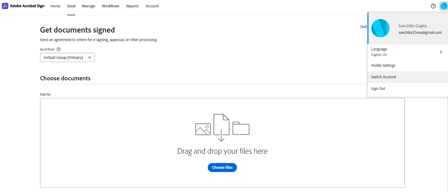 - Advanced Sharing is an important feature when agreement oversight or a collaborative team environment is required. Advanced Sharing can be enabled on your account by the Acrobat Sign support team if it is not visible to the account admin. This feature will provide advanced capabilities, such as Modify and Sending access to other’s accounts which can be strictly managed at the account or group level. Additionally, Account Admins have visibility to “Shared Users”. Users will be able to view and manage other’s accounts from the Manage Page. However, the Sending feature is performed by a “Switch To” option under the Profile icon. When you have larger teams that need to share responsibility for agreements that are sent out for signature, establishing a centralized service account to manage them and sharing it out to the team. This can build resiliency across the management of agreements, as individual sharing can become challenging to manage as the team grows. Overall, this improves better team collaboration and oversight of In Progress agreements, reducing the abandonment or expired agreements.