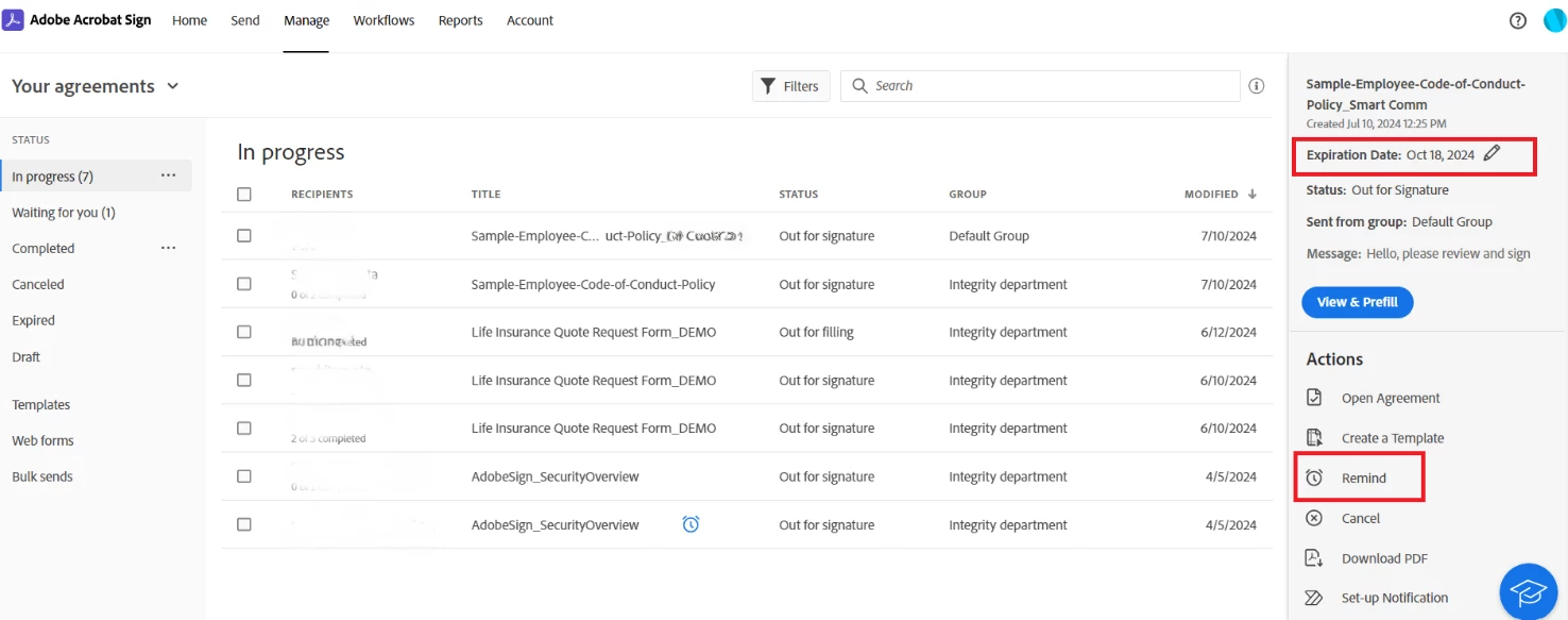 - Through Reminders in Acrobat Sign, senders can set an automatic reminder frequency to inform the recipient of an incomplete action. This can reduce circumstances where agreements are abandoned or expired due to neglected .