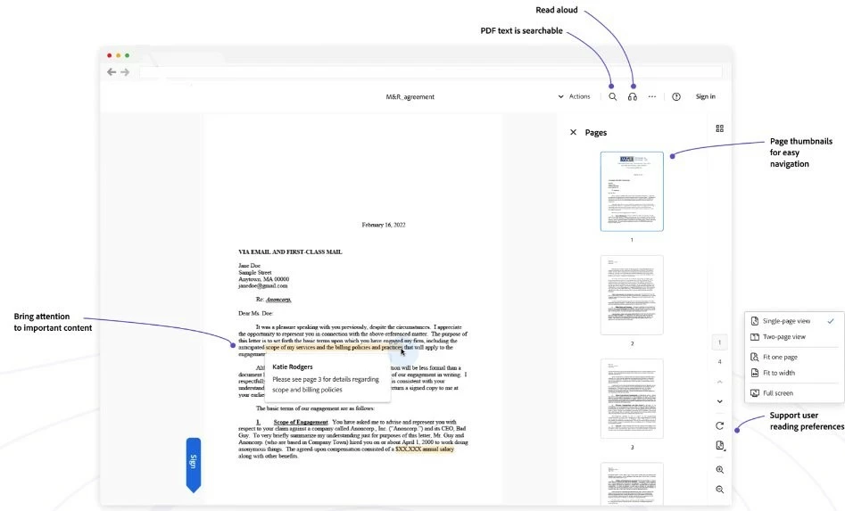As inventor of the PDF format with a strong commitment for Accessibility, Adobe is here to make a change. Starting with the September 2024 Release, Acrobat Sign will offer a new Recipient Experience that removes the image related limitations by allowing the signer to review the agreement in its native PDF form using the Modern Acrobat Viewer, the best PDF Viewer of 2024.