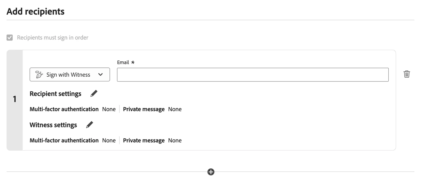 Many agreements (such as tax documents, land registry, powers of attorney, transfers of assets) require that the recipient sign their agreement in the presence of a witness. With the September 2024 Release, Acrobat Sign introduces a new selectable role- “Sign with Witness” which determines the process of a "signer" associated "witness" recipient which the signer must define.