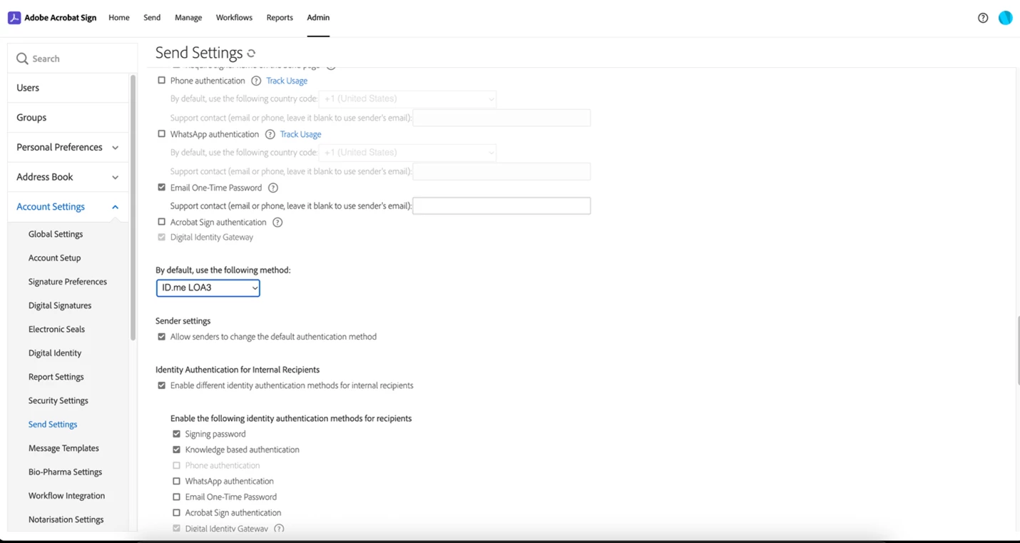 For administrators, the change is straightforward: the Send Settings page now includes DIG-enabled identity providers alongside existing authentication options. Selecting a default for internal and external users is a one-time configuration that immediately governs all new agreements.