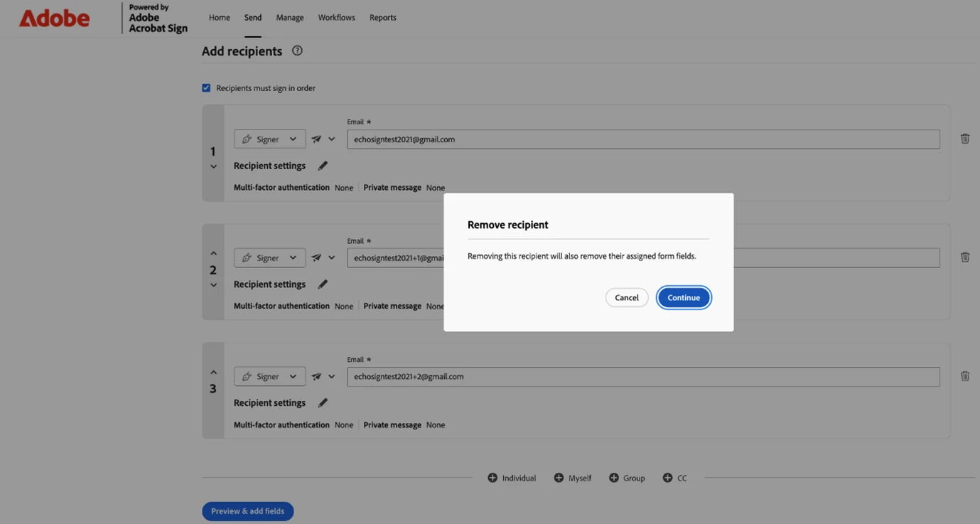 - The agreement creator can remove recipients from in-flight agreements, even after the signing process has begun