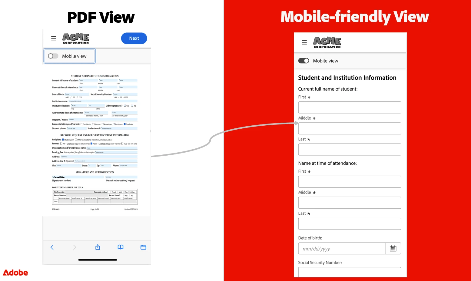 Filling a form and signing it on mobile devices can be cumbersome if the document was not created with mobile users in mind. Thats why Adobe is stepping in to provide a much better experience – automatically generated and easily adjusted before sending it off to the intended recipients. By offering a mobile friendly focus view, mobile users can more easily fill in required data and sign without any need to zoom in or struggle to hit the right field with their fingertips. Discover the new Mobile-friendly View: