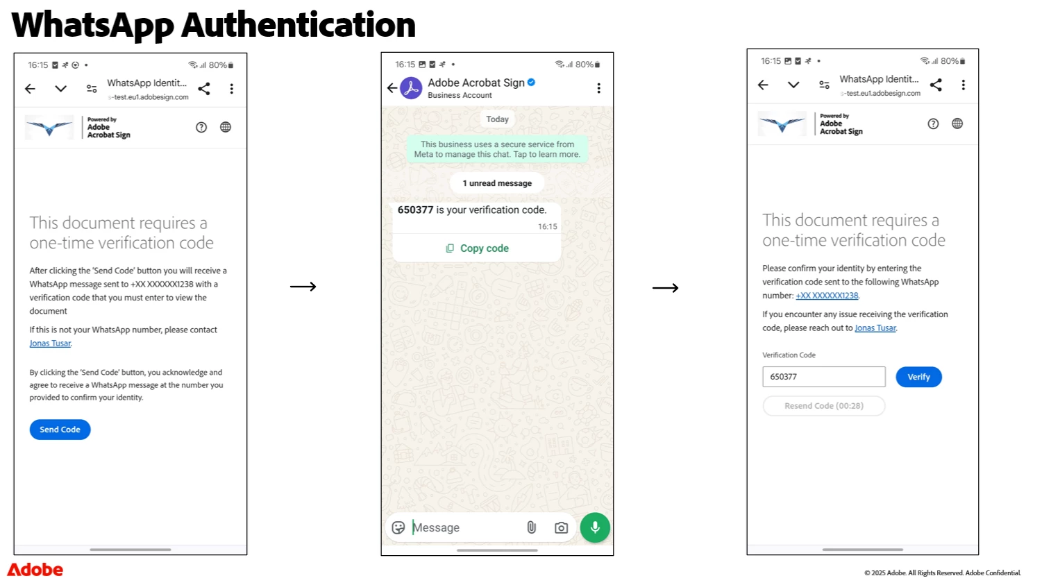 Verifying users with a second factor is a global best practice for baseline authentication, and phone one-time passcodes (OTP) continue to be a leading method. That’s why Acrobat Sign now offers an alternative delivery method of delivering the OTP via a WhatsApp message. The message is sent by a verified Adobe Acrobat Sign WhatsApp for Business account, delivering the OTP to the WhatsApp account of the configured telephone number of the recipient. This gives users a modern, secure, and more reliable way to receive OTPs and verify themselves—especially in regions where WhatsApp is the go-to communication platform.