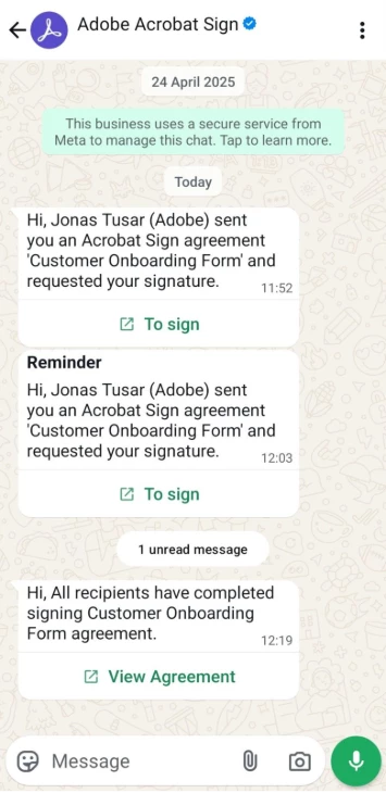 Grabbing signers' attention to review and sign agreements can be more successful if organizations communicate with them on the right channel. Thats why Acrobat Sign introduces WhatsApp Delivery for Agreement Notifications. Via this new capability, messaging to signers is delivered via a verified WhatsApp for Business message to the signers WhatsApp account – either in addition to an email notification or as the sole message if the e-mail of the signer is unknown.