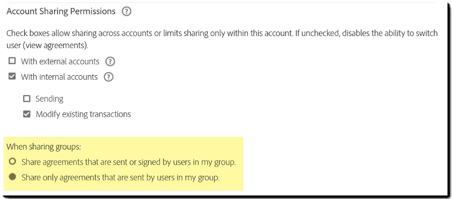 Account Sharing is a widely used feature that helps strengthen collaboration between colleagues and departments. However, it provides wide access to agreements that participating users have received. Therefore, Acrobat Sign introduces a new control for admins that when enabled restricts the shared view of agreements to only those agreements sent from the user’s group. Hence, agreements that are received from an external group will be filtered out to protect potentially sensitive information. This filter exclusively applies to the group-level.
