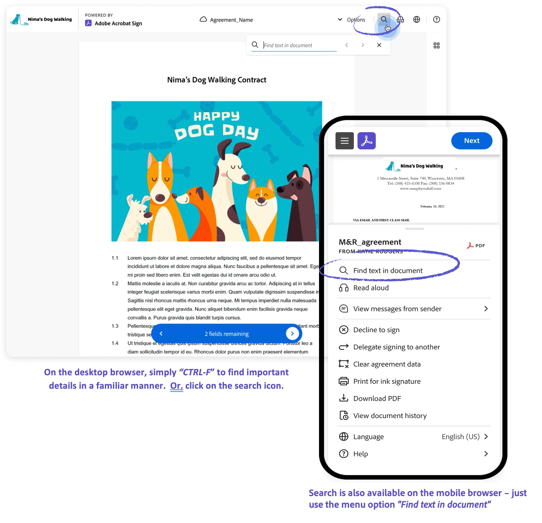 Signing an agreement isn’t just about placing a signature. When working with documents – especially lengthy ones such as contracts – finding specific information can make all the difference. We added search functionality so users can get to the details they care about easily. It's as easy as "CTRL-F".