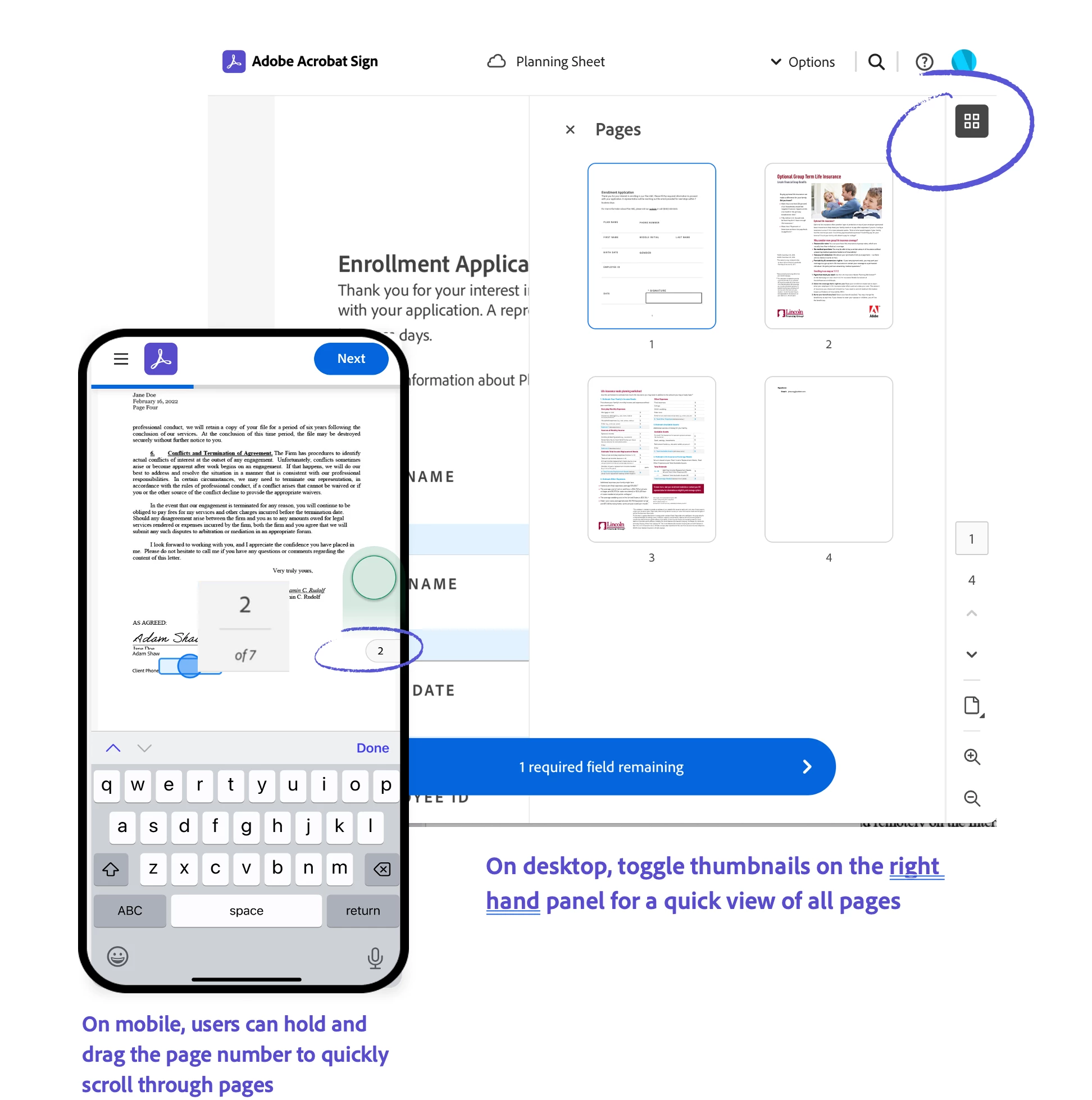 To make it easier to browse long documents – such as onboarding handbooks, training materials, etc. - we’ve included thumbnails for quick references. Instead of scrolling each page, signers can get a sense for the document’s content with high resolution page thumbnails on the right-hand pane.