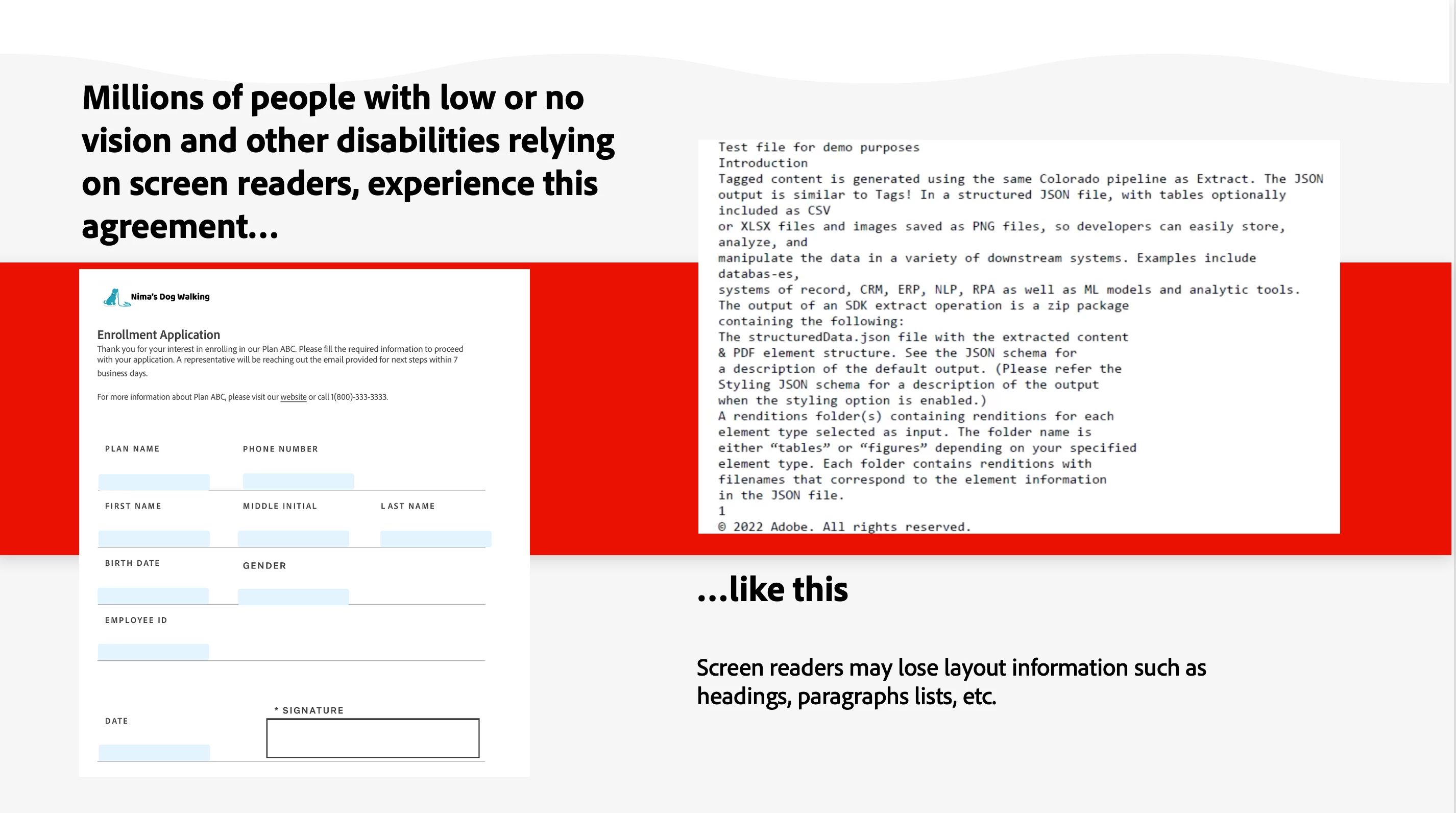 Existing e-signature solutions reduce agreements to flat images, erasing critical formatting and accessibility. This turns clear, structured text into an unformatted text blob, making agreements harder to read and engage with effectively. Layout structure such as headings, paragraphs, tables which are critical for comprehension are lost, making it hard for screen reader users to read document information or complete tasks. In the worst case, signers cannot read the document at all.