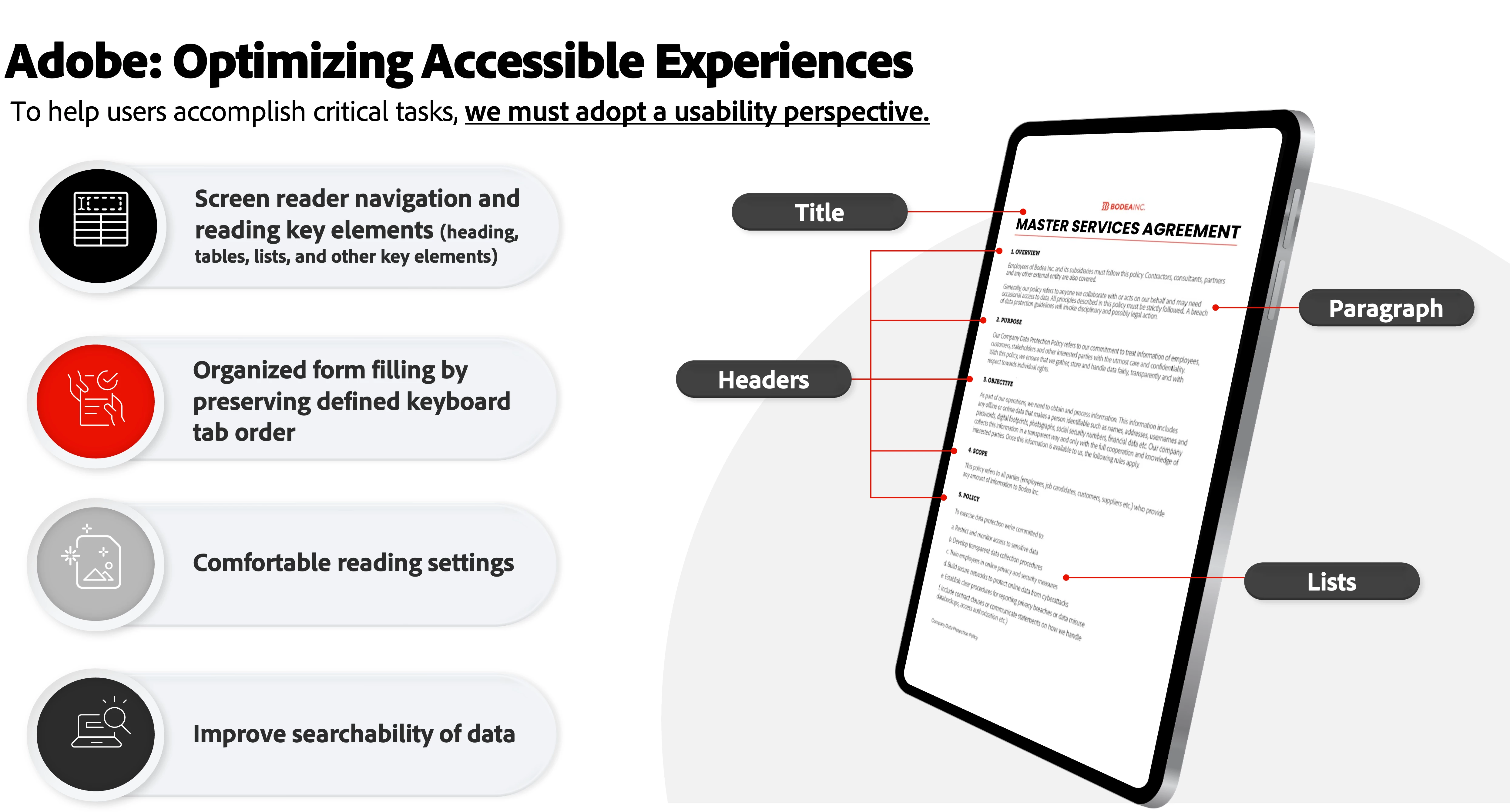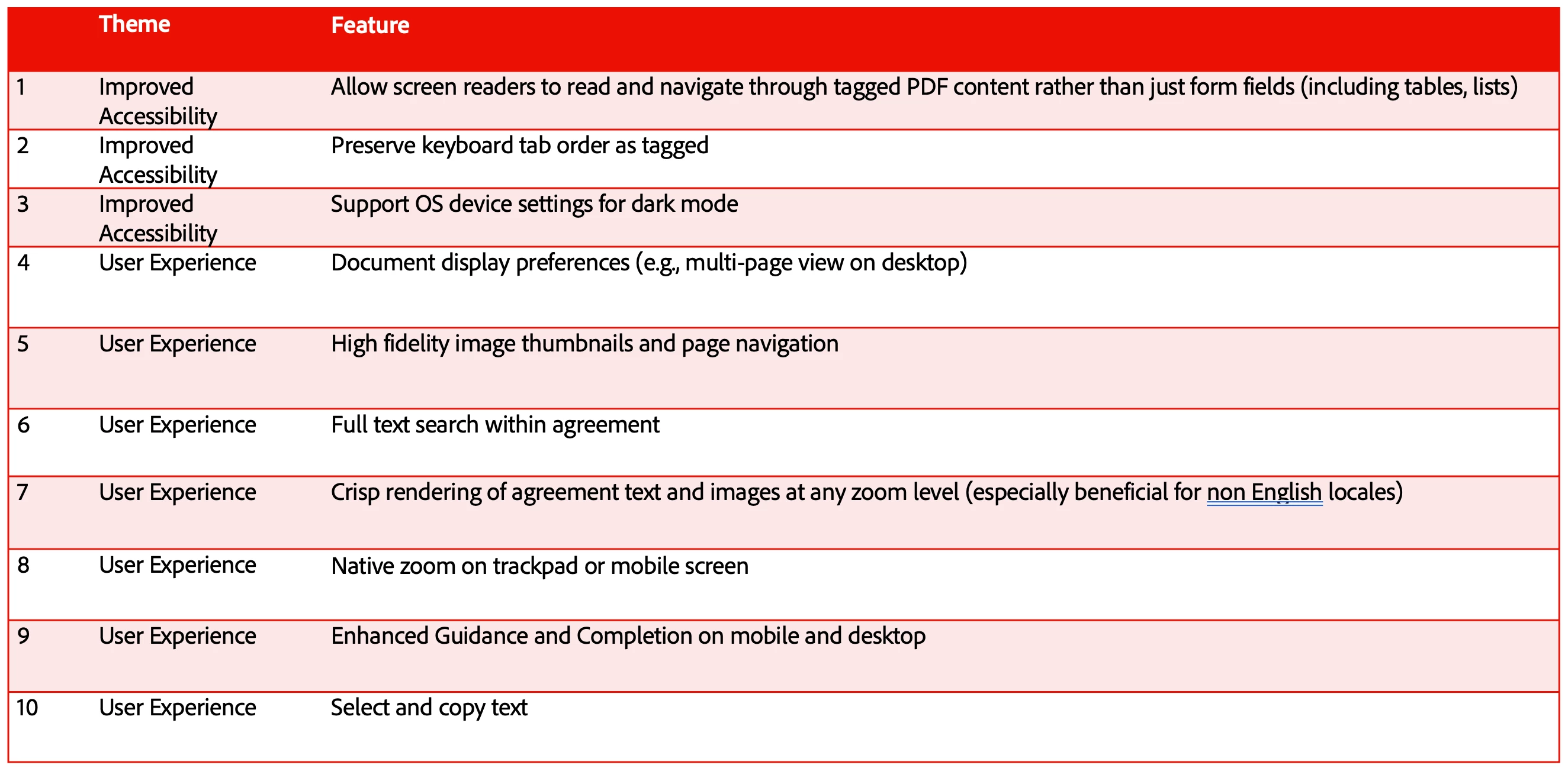 With over 1.3 billion people experiencing significant disability (1 in 6 of the population), it is critical that digital agreement workflows are accessible. Not only is digital accessibility an opportunity to build trust with clients, partners, and employees, but regulatory guidelines have continued to get more rigorous in this area. This is especially relevant for industries such as healthcare, education, and government. Adobe has long been a trusted leader in documents, known for creating the PDF format and leading the development of accessibility features within PDF. As digital accessibility laws evolve, we are improving our platform to help create a more inclusive digital world.