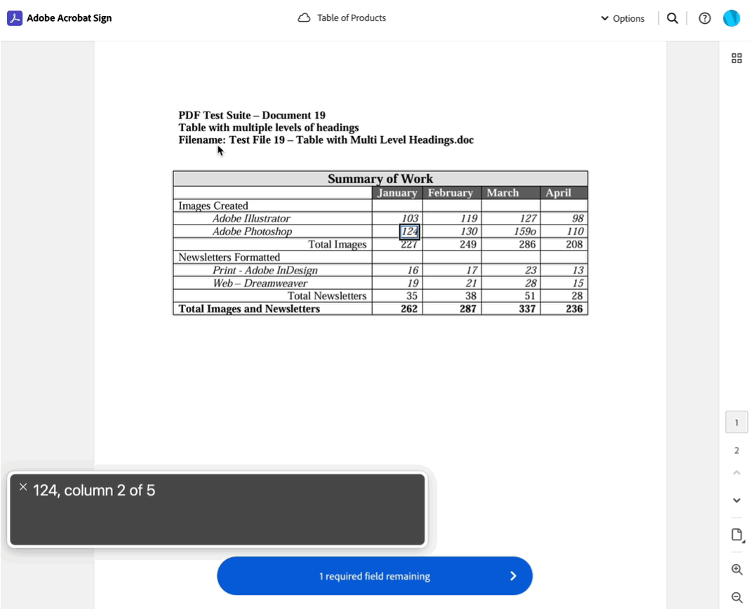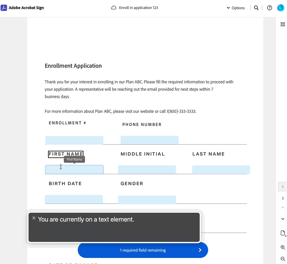 When agreements have many form fields, it is important that the user understands the correct sequence of form filling. This leads to a disorganized and frustrating form filling exprience. Unless the structural tags, including tab order, are guiding the user, moving logically from one form field to the next becomes difficult. As a result, keyboard users may jump to unrelated sections or miss fields completely. This lack of structure is time consuming and may cause delays in agreement completion – or worse, not being able to complete the agreement at all.