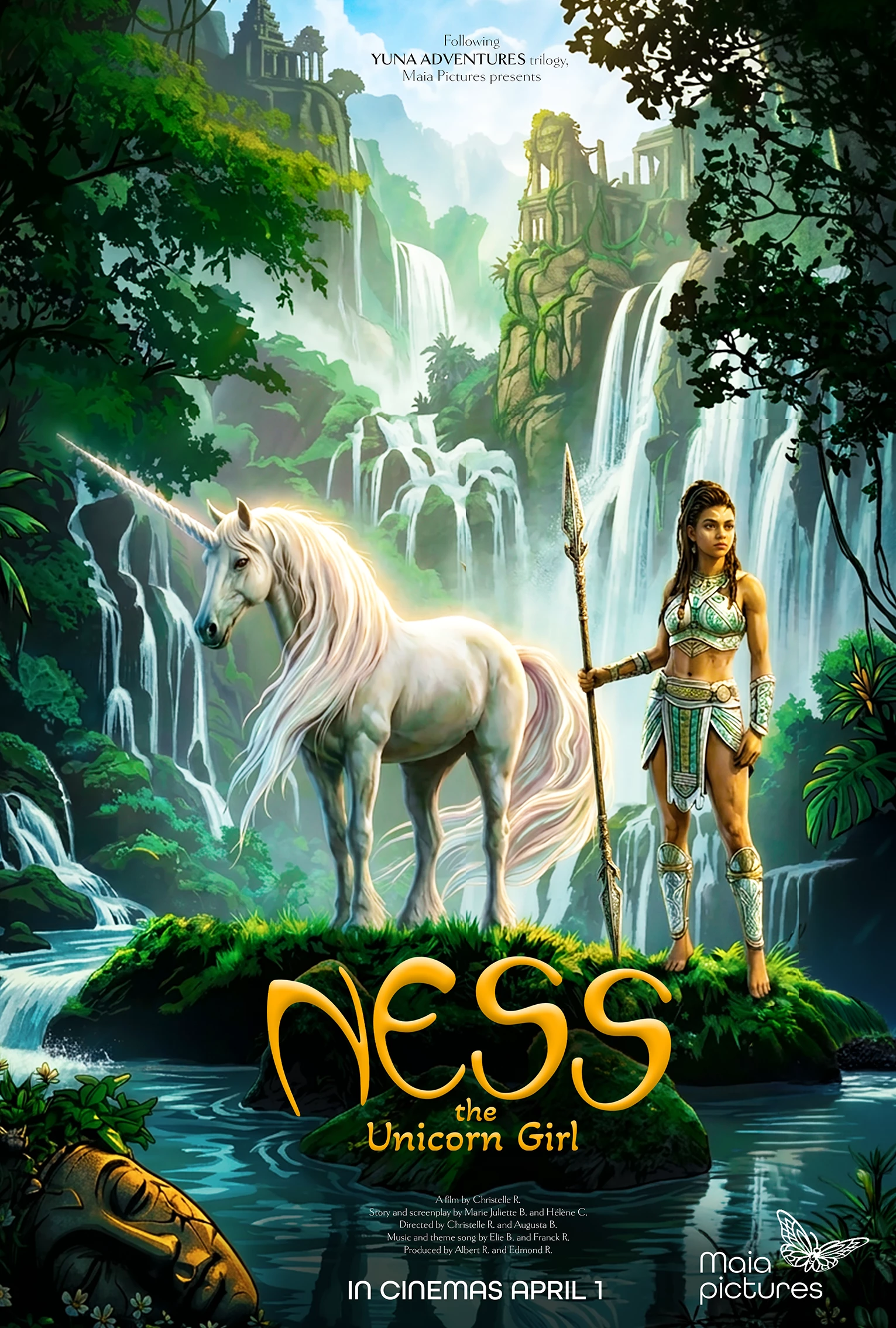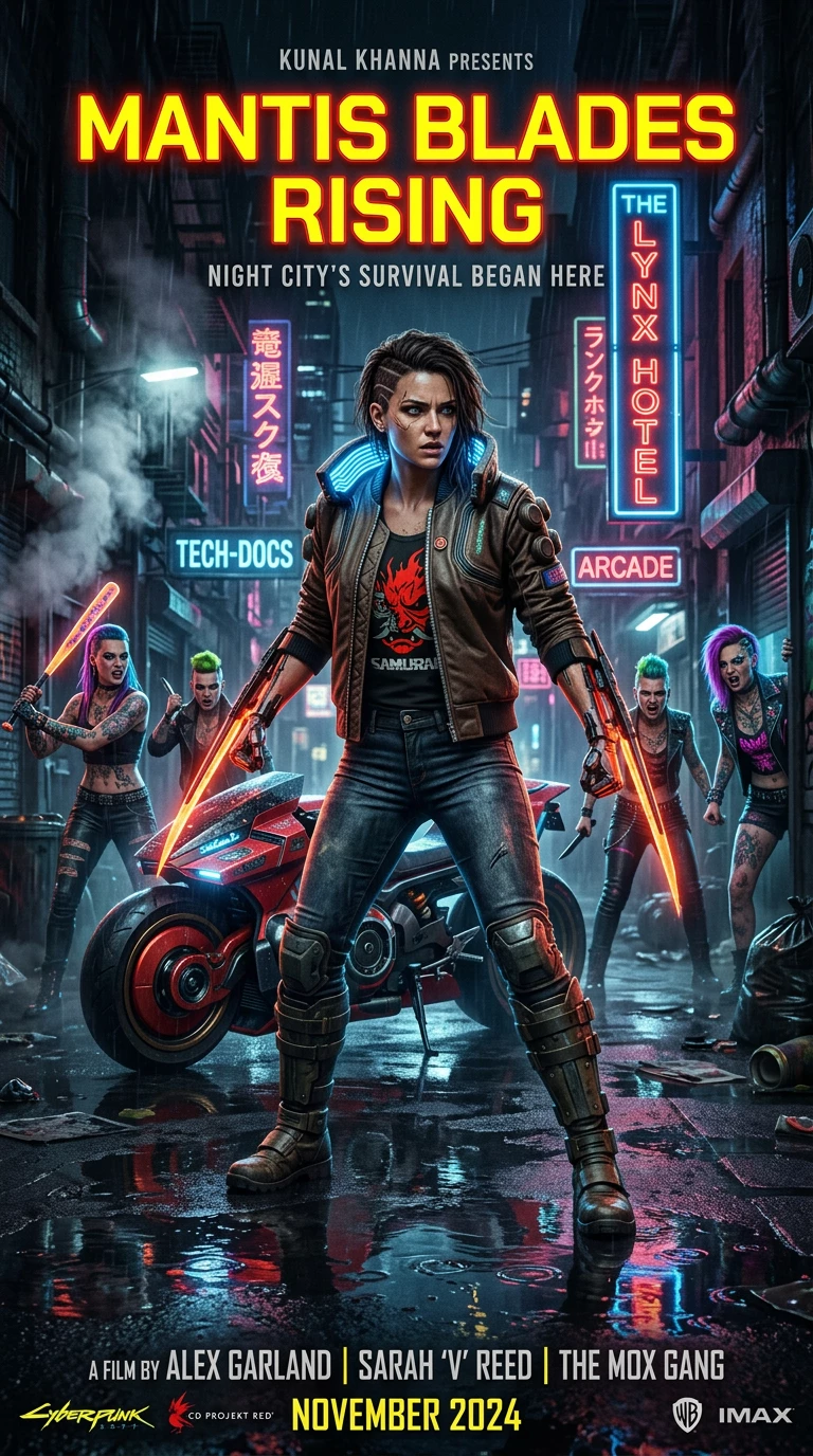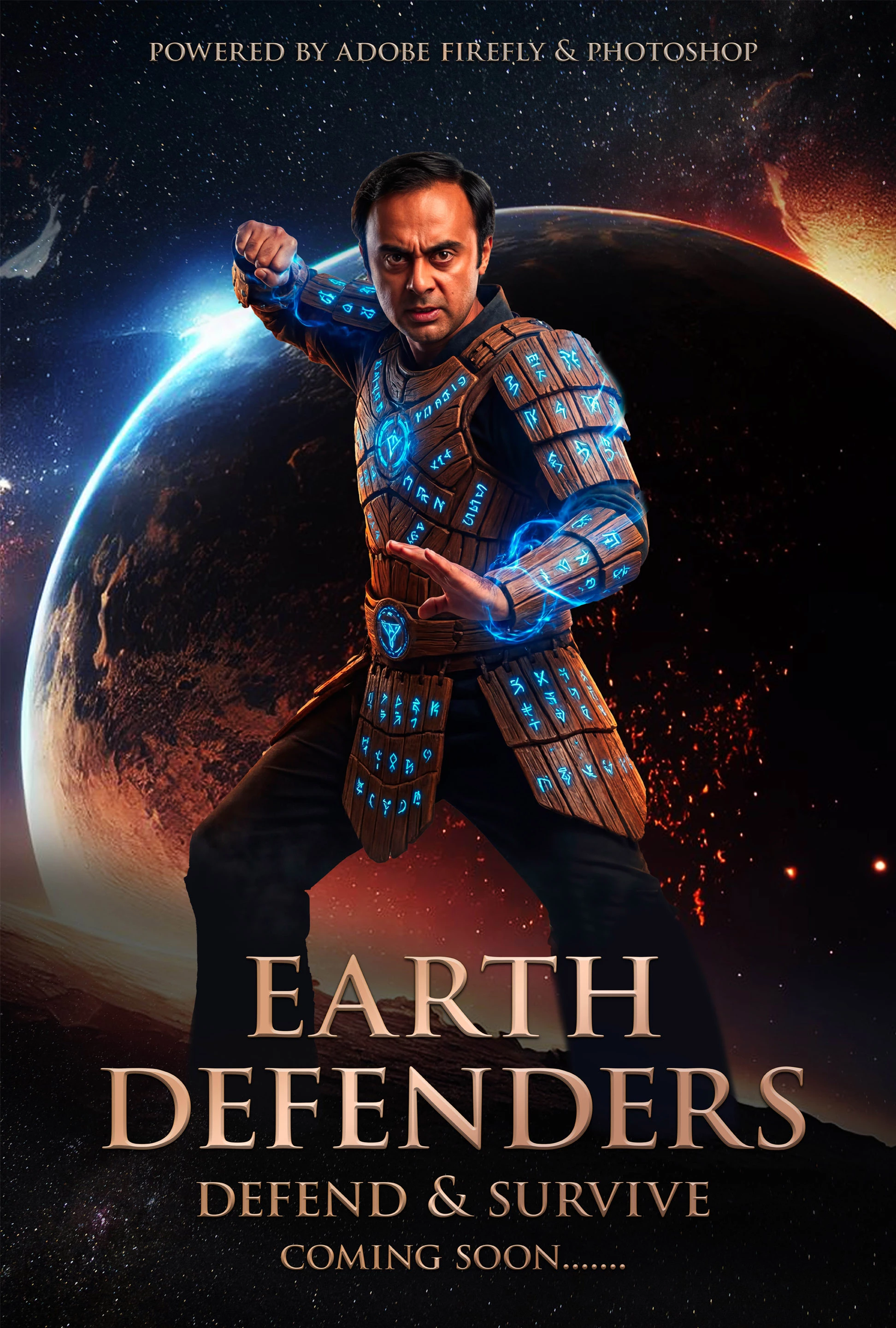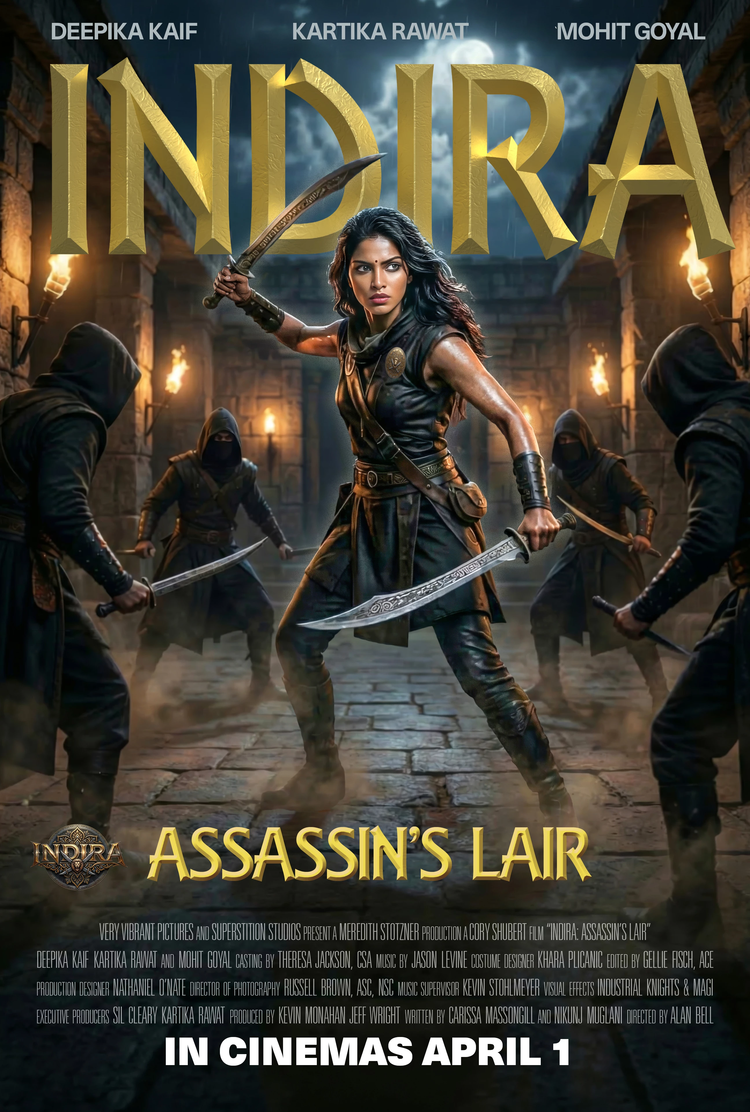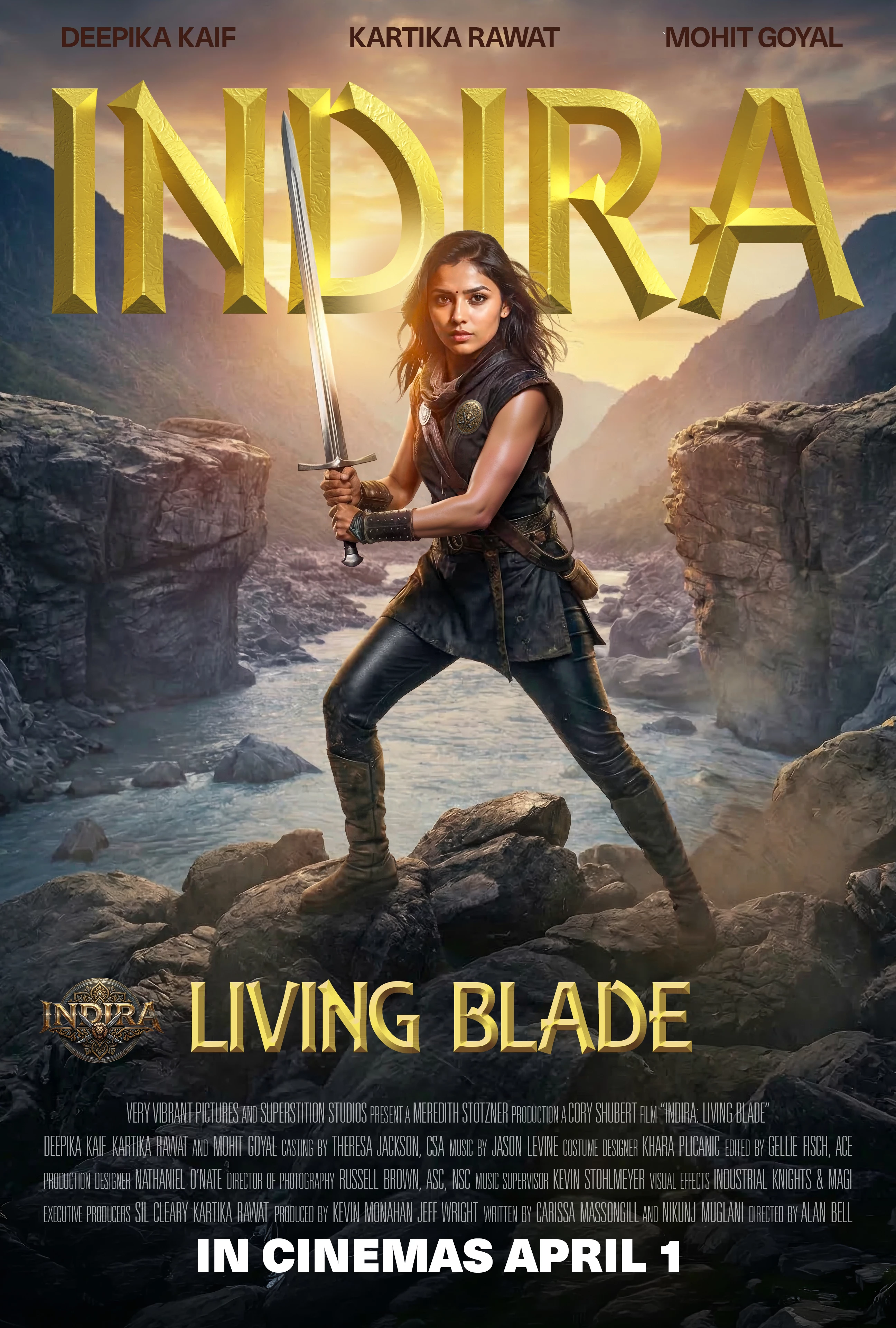 This poster starts with the main image, “split” in Photoshop so that the Indira hero is on a separate layer from the background. Generative Expand in Photoshop extended the image to the correct 27x40 aspect ratio and I used the Camera Raw filter to adjust the lighting, contrast, color, and sharpness of the Indira character. The Indira character is a little too small in the AI-generated original, so I also enlarged her. The Indira “franchise” logo is from Nano Banana.