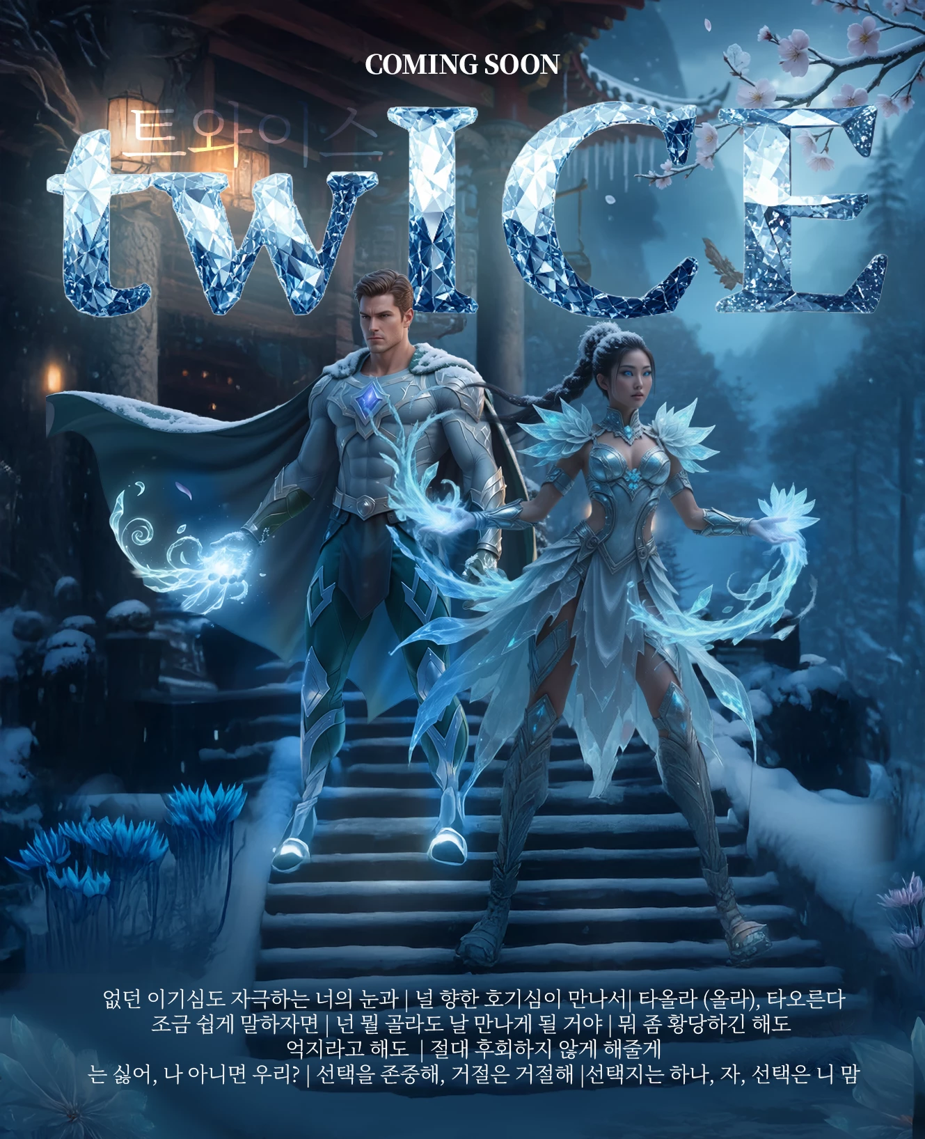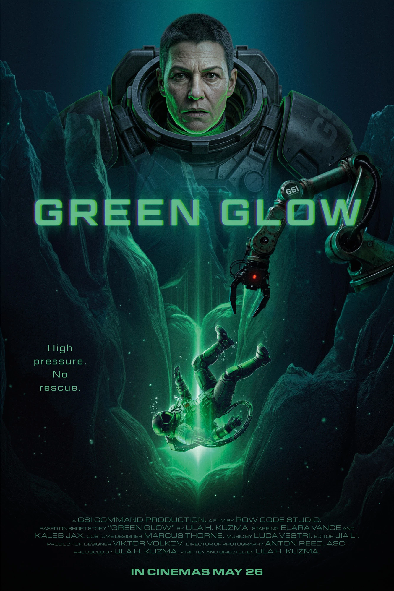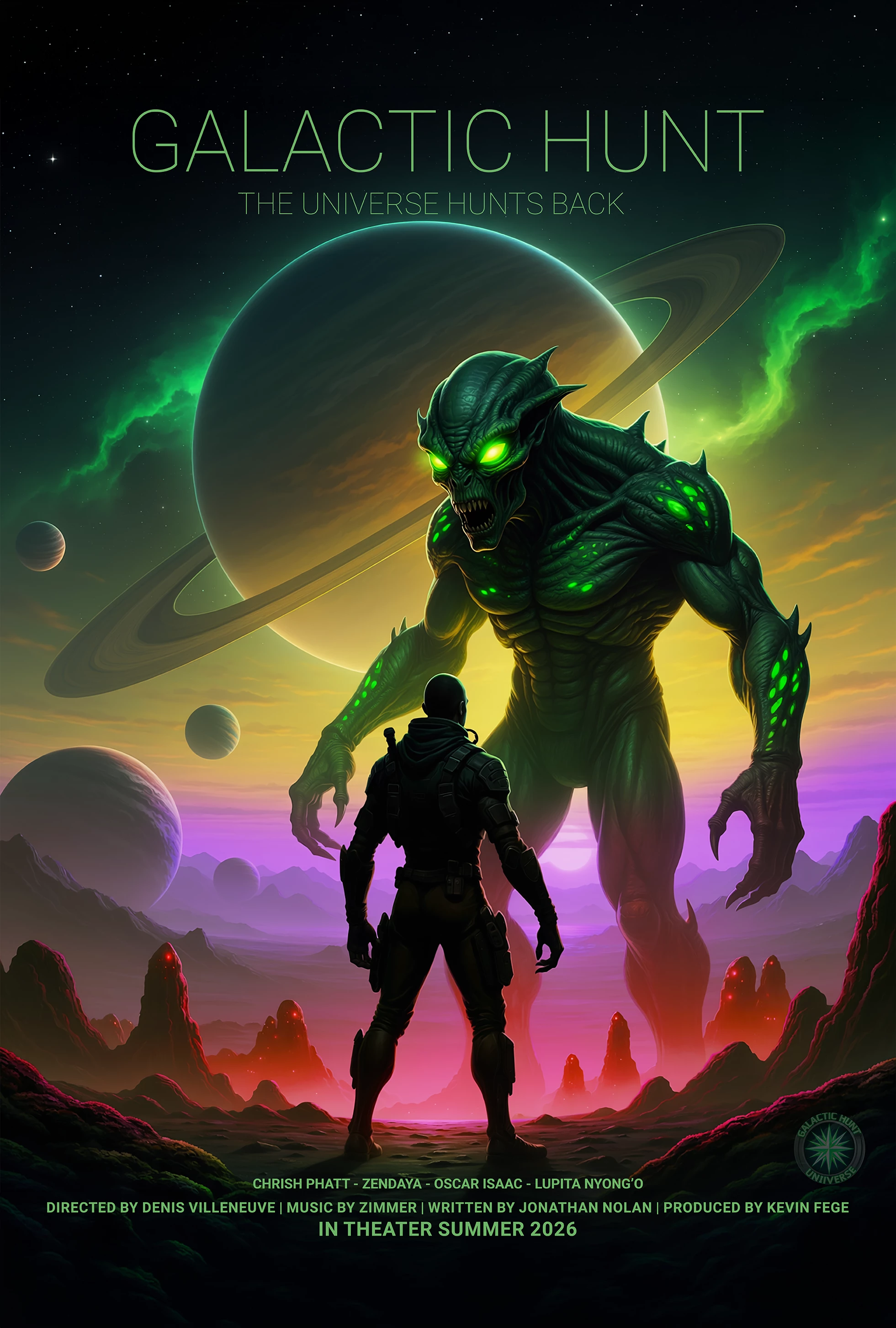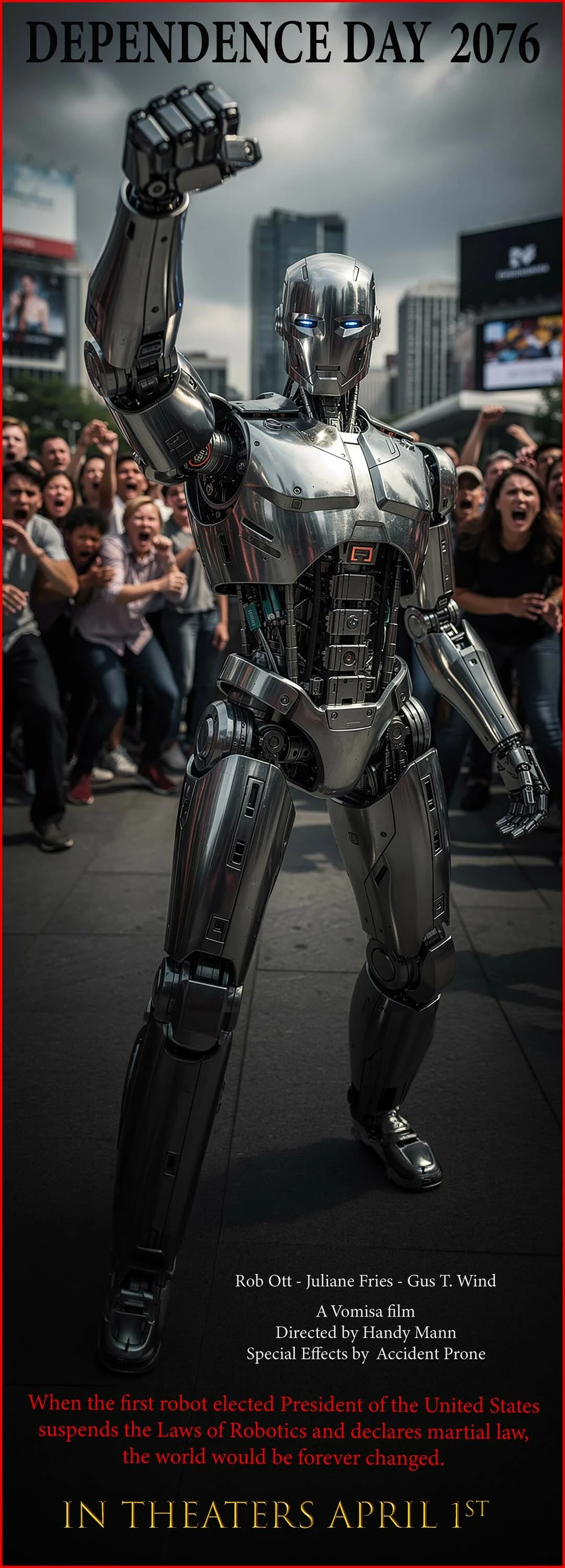 This poster starts with the main image, “split” in Photoshop so that the Indira hero is on a separate layer from the background. Generative Expand in Photoshop extended the image to the correct 27x40 aspect ratio and I used the Camera Raw filter to adjust the lighting, contrast, color, and sharpness of the Indira character. The Indira character is a little too small in the AI-generated original, so I also enlarged her. The Indira “franchise” logo is from Nano Banana.
