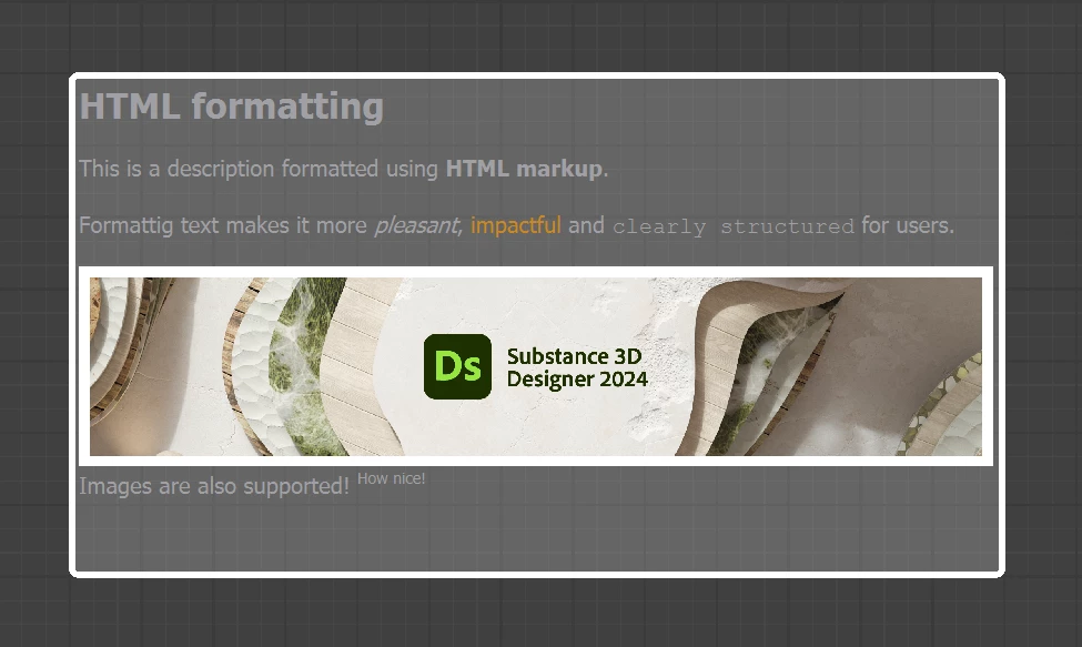- Enhanced description: thanks to HTML code, you can now have formatted texts in frames description. This applies to Comments as well.