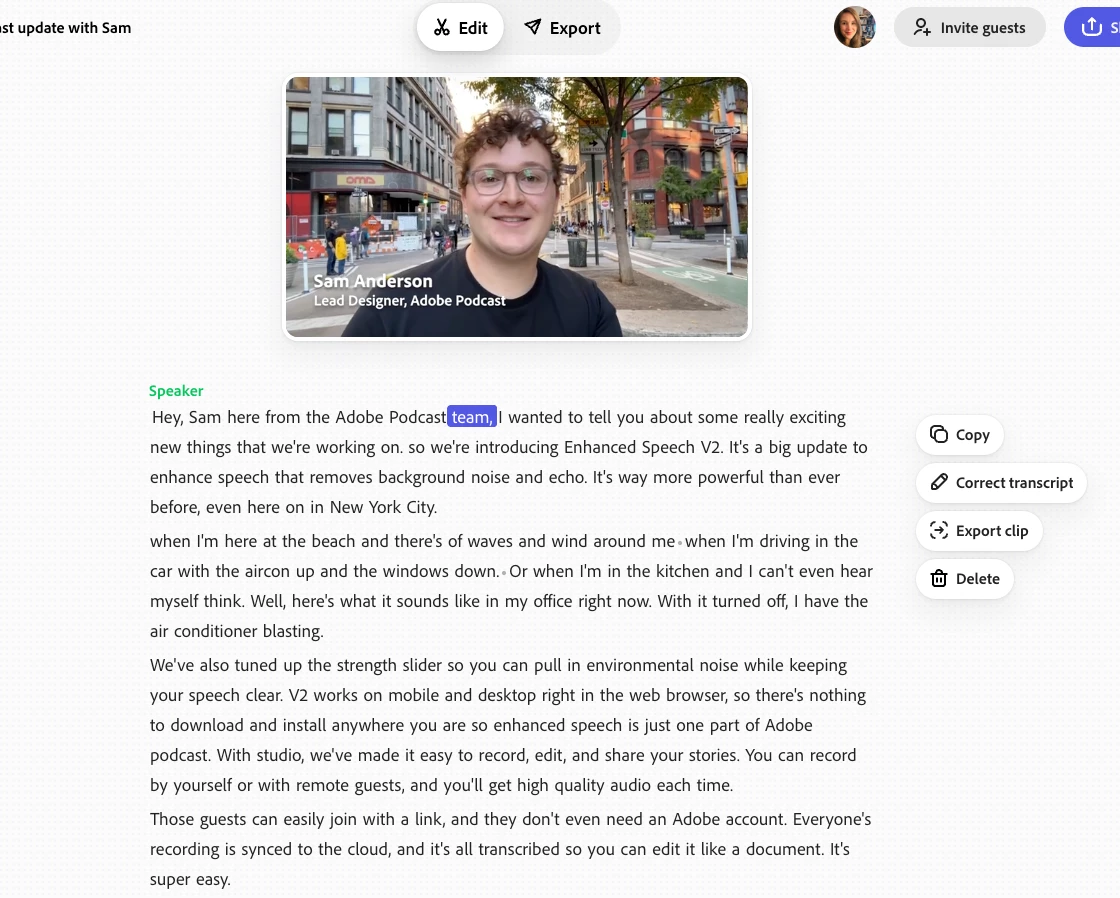 Now you can upload, transcribe, and edit video in Adobe Podcast Studio—just like editing text. It's perfect for video interviews, talking head clips, and anything you want to clean up or share quickly.