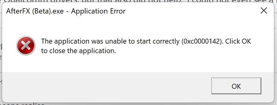 In order to ensure After Effects works in emulation, please first download and install the most recent Qualcomm Adreno GPU driver for Snapdragon X Platform here: https://softwarecenter.qualcomm.com/catalog/item/Windows_Graphics_Driver?osArch=ARM64&osType=Windows&version=250304031.0.96.0