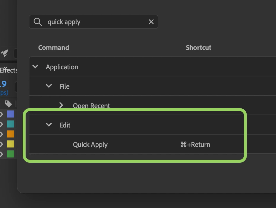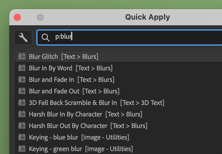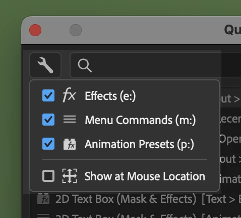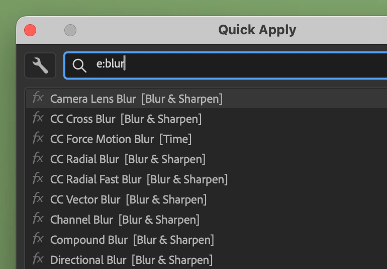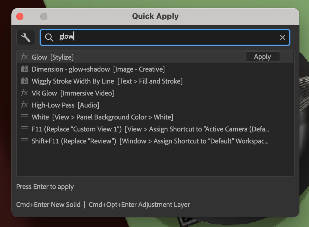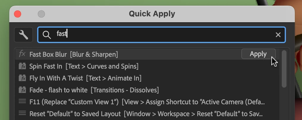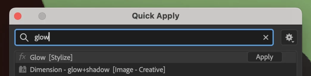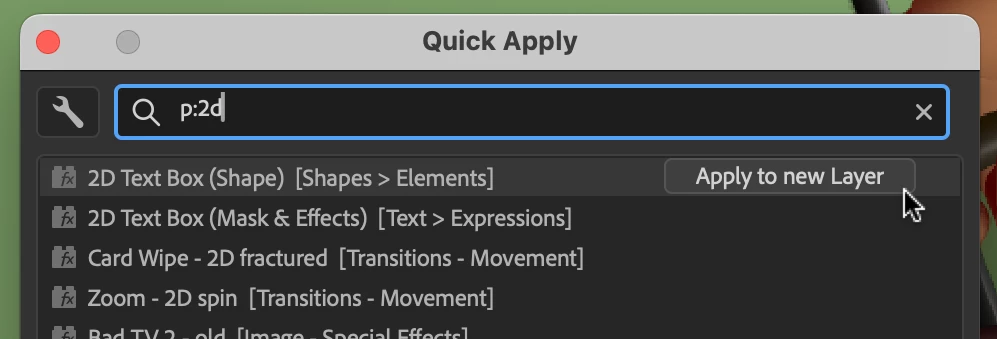 We are very excited to unveil Quick Apply in After Effects (Beta) 26.2.0.30 or higher. Quick Apply is a search box that puts every effect, animation preset, and menu command right at your fingertips. Type a few characters, pick what you want, and apply or run it. It’s that simple.