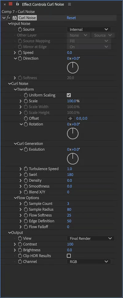 Softness (0–100, only available with layer-based sources) blurs the input noise field. At 0, the source is used as-is. Increasing it smooths out fine detail in the source, which produces gentler, more gradual changes in curl direction. If your source has sharp edges or rapid brightness changes raising Softness is usually the fix.