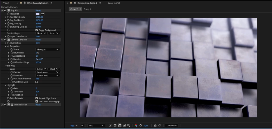 Displacement can also be used to drive effects. Pre-compose your 3D scene and apply 3D Channel Extract to get the scene’s depth map or apply a 3D channel effect like Fog 3D or Depth of Field to the pre-comp to access the depth data directly.