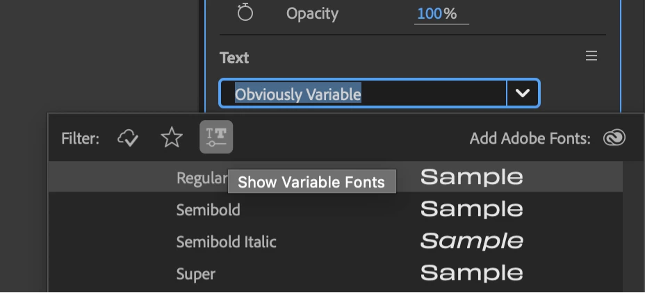 Since we introduced Variable Font Animation in After Effects, a lot of you have been exploring weight, width, slant, and custom axes in the Timeline and Properties panel. One thing we heard clearly is that it’s still hard to spot which fonts in the menu are actually variable when you have a huge library.