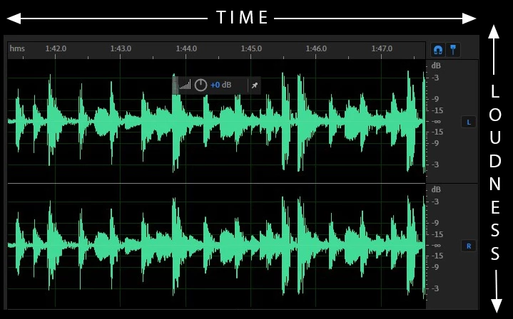 Waveform Display shows the variation of Amplitude or the loudness (on Y-axis) of the signal with respect to time (on X-axis). It is useful for analyzing the overall loudness and sections of silence In the audio. It is also good for identifying percussive changes in vocals, drums, and more. To find a particular spoken word, for example, simply look for the peak at the first syllable and the valley after the last. Learn more about the Waveform Display.