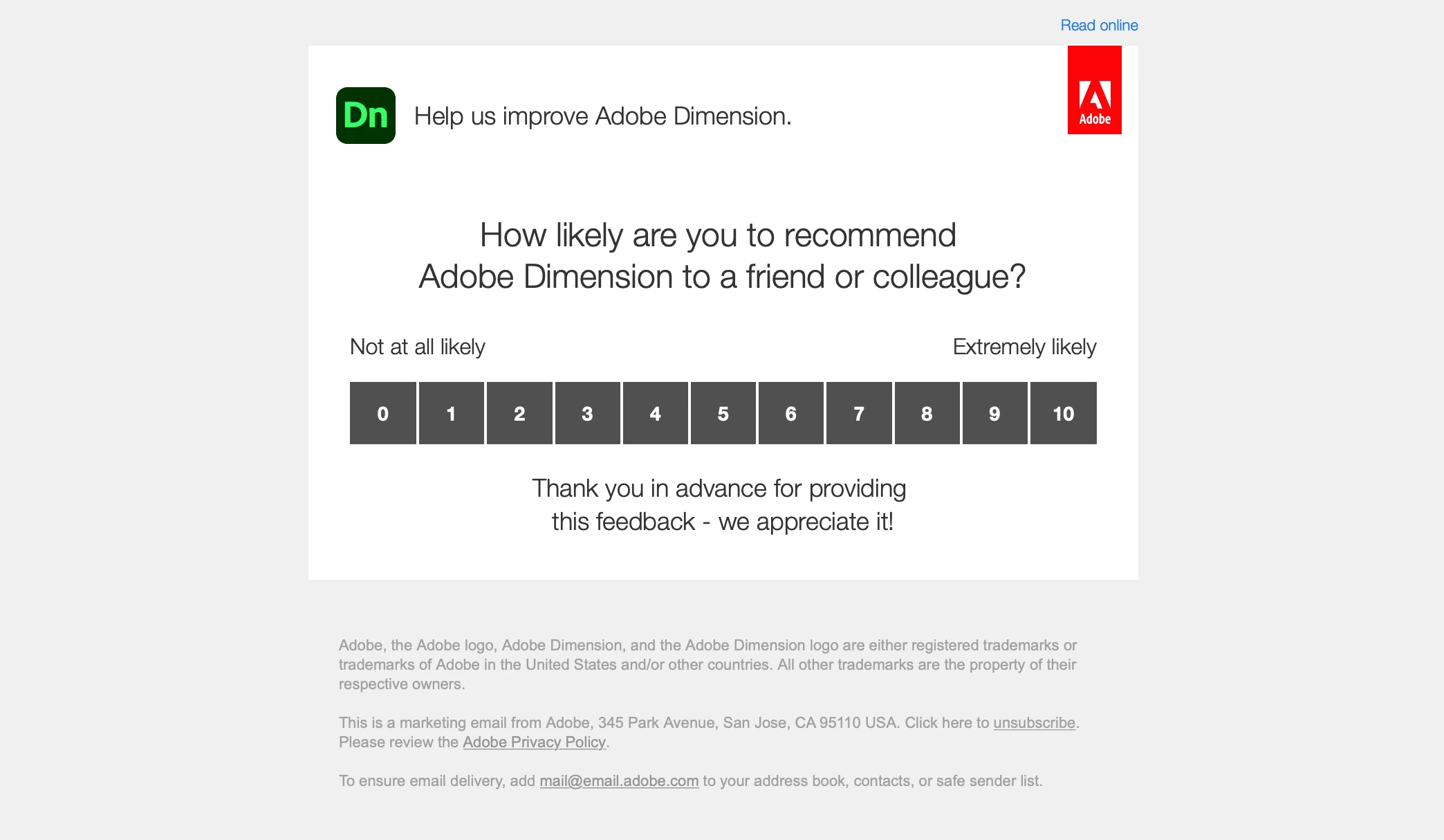 Interestingly, Adobe sent me an email this week asking for me to "Help us improve Adobe Dimension" by asking me "How likely are you to recommend Adobe Dimension to a friend or colleague?"