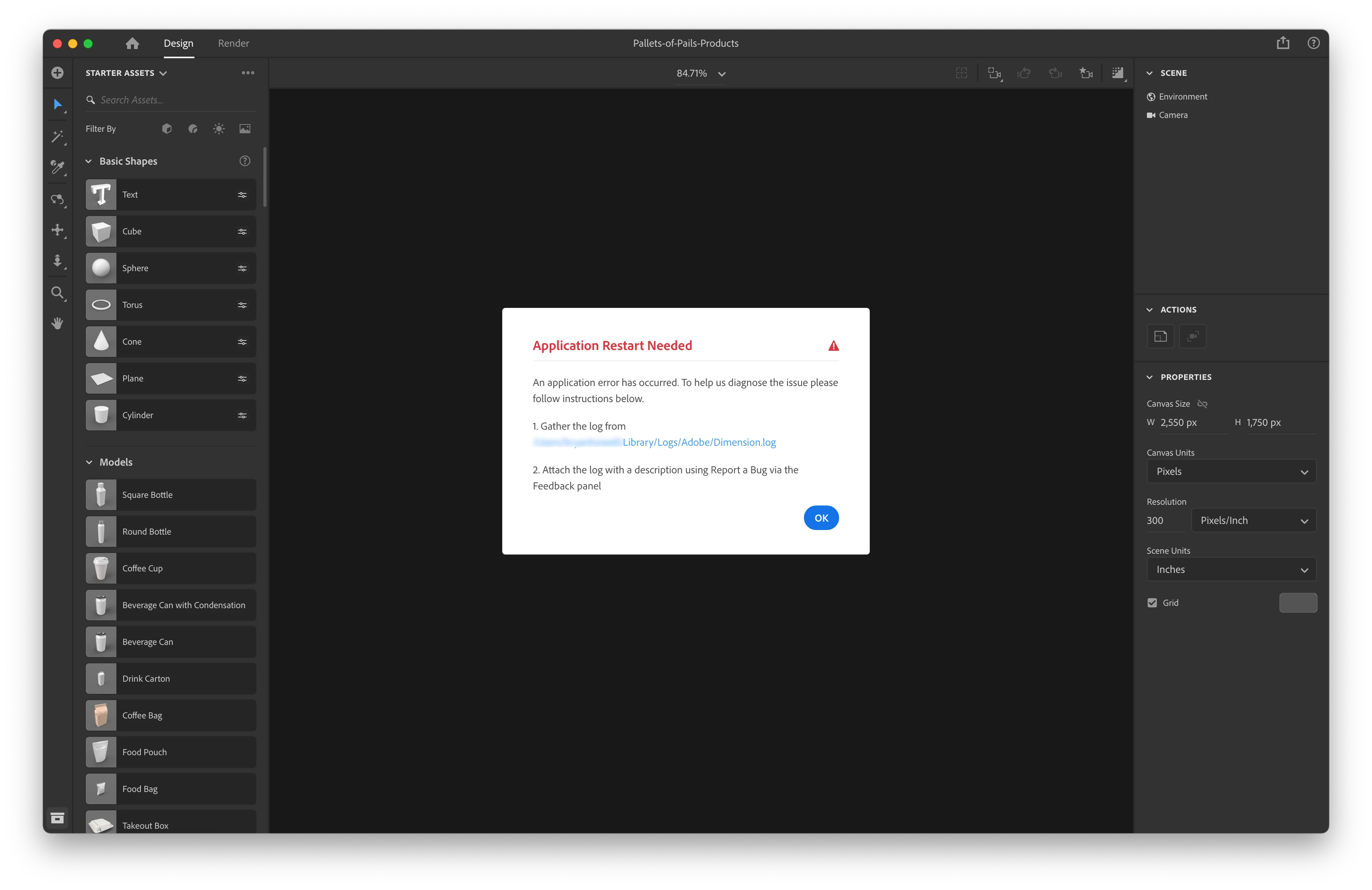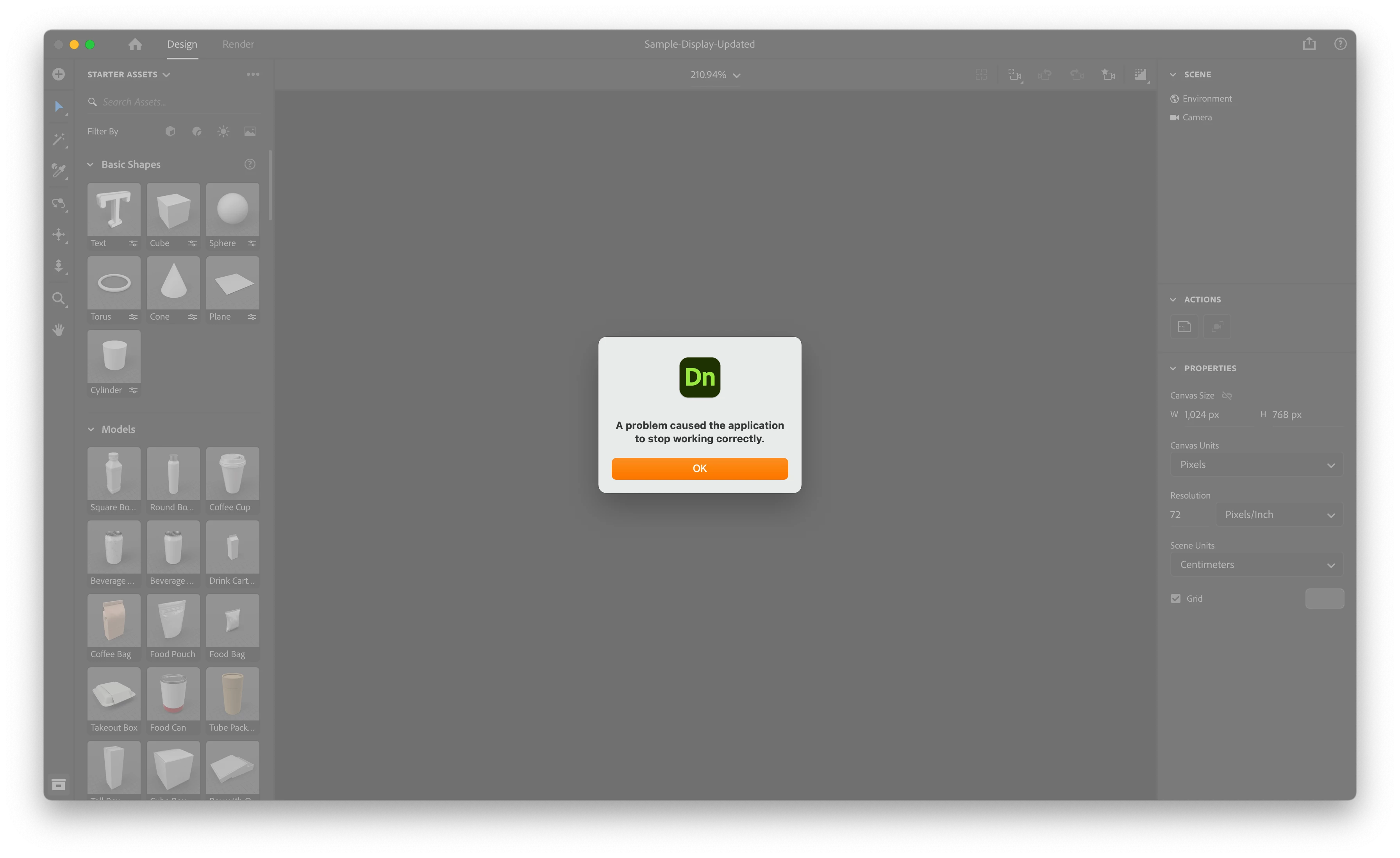Hey folks, just an update on my end, since we're not really getting anything helpful from Adobe. I've been experiencing consistent issues with Dimension (just starting this week) wherein I'm getting the attached error "A problem caused the application to stop working correctly." with no other explanation or help or steps to take. I've reached out to support twice, screenshared with them twice. Have sent them 2 different particular Dimension files that I've experienced this issue with (one 1.53GB and one simply 35.3MB) and have shared my log files. I lost A LOT of time and work and I've still gotten no explanation. I've also reached out to Apple to confirm that my graphics drivers are up-to-date and also Boxshot whose Origami plugin for Illustrator I used to create some OBJ models. Both Apple and Boxshot say everything is good from their hardware/software, so that leaves Adobe.