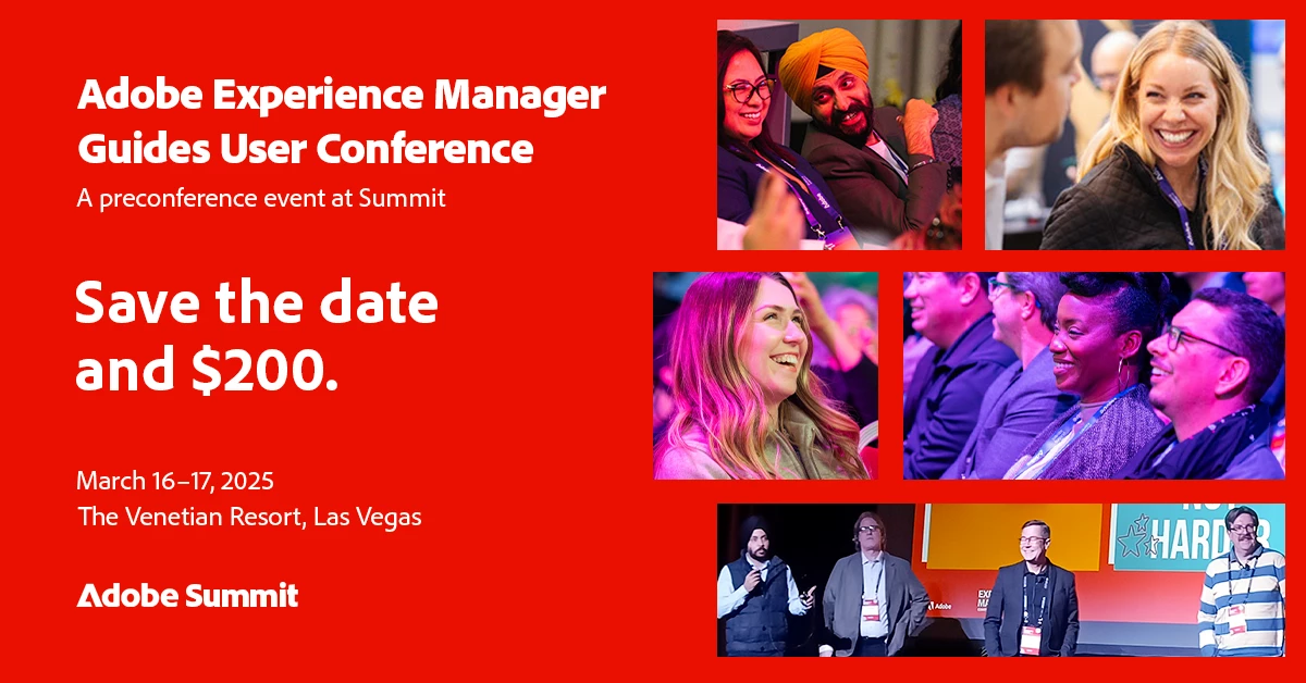 Registration is now open for Adobe Experience Manager Guides User Conference 2025, now a part of Adobe SUMMIT! Join us in Las Vegas March 16 – 17 to discover how digital-first businesses deliver exceptional experiences with technical documentation and knowledge content.
