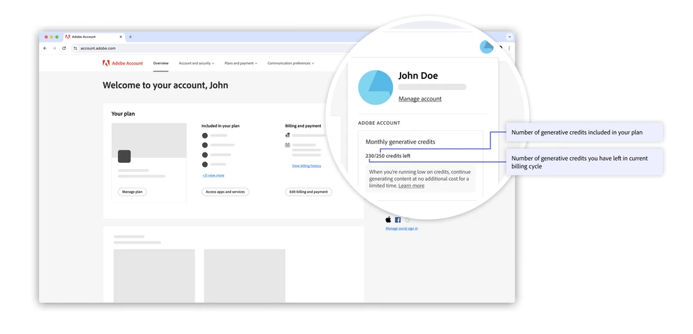Your plan-specific information will be available on your Adobe account management page, where you can review your generative credit allocation, usage, and experience when you exhaust your generative credits.