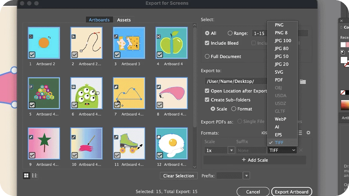 Export your Illustrator files directly to Adobe Cloud storage using Export for Screens, making it easy to access, share, and reuse your work anytime across desktop and web.