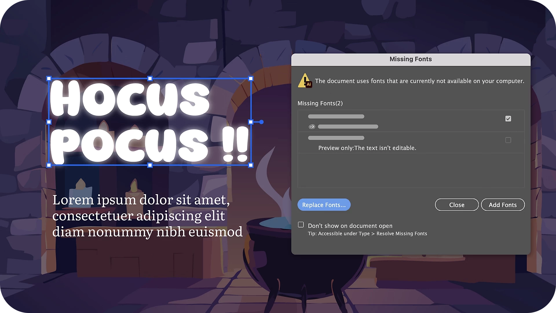 • Update to Illustrator 29.3 to preview missing fonts.