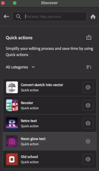 Quick Actions consolidate a series of steps that are required to perform common tasks into a single click to help you quickly add Neon effect to text, convert Sketch to Vector, apply retro text effect, and more!