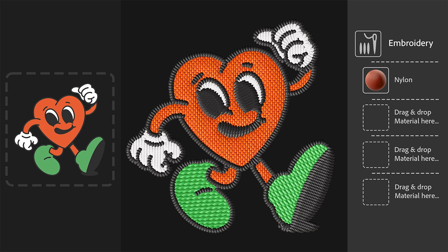 The updated Embroidery filter has improved stitching precision and supports up to 8 colors. The material's inputs are back in the layer stack which enables the insertion of other metarials in the patch.