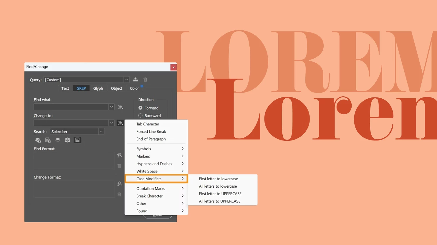 Change Text Case in few simple steps: You can easily change text cases with just a few clicks, ensuring consistency across your designs. This feature streamlines text editing, saving you time and effort. Enhance your workflow by adjusting text case quickly from the Text or GREP tabs of the Find/Change panel.