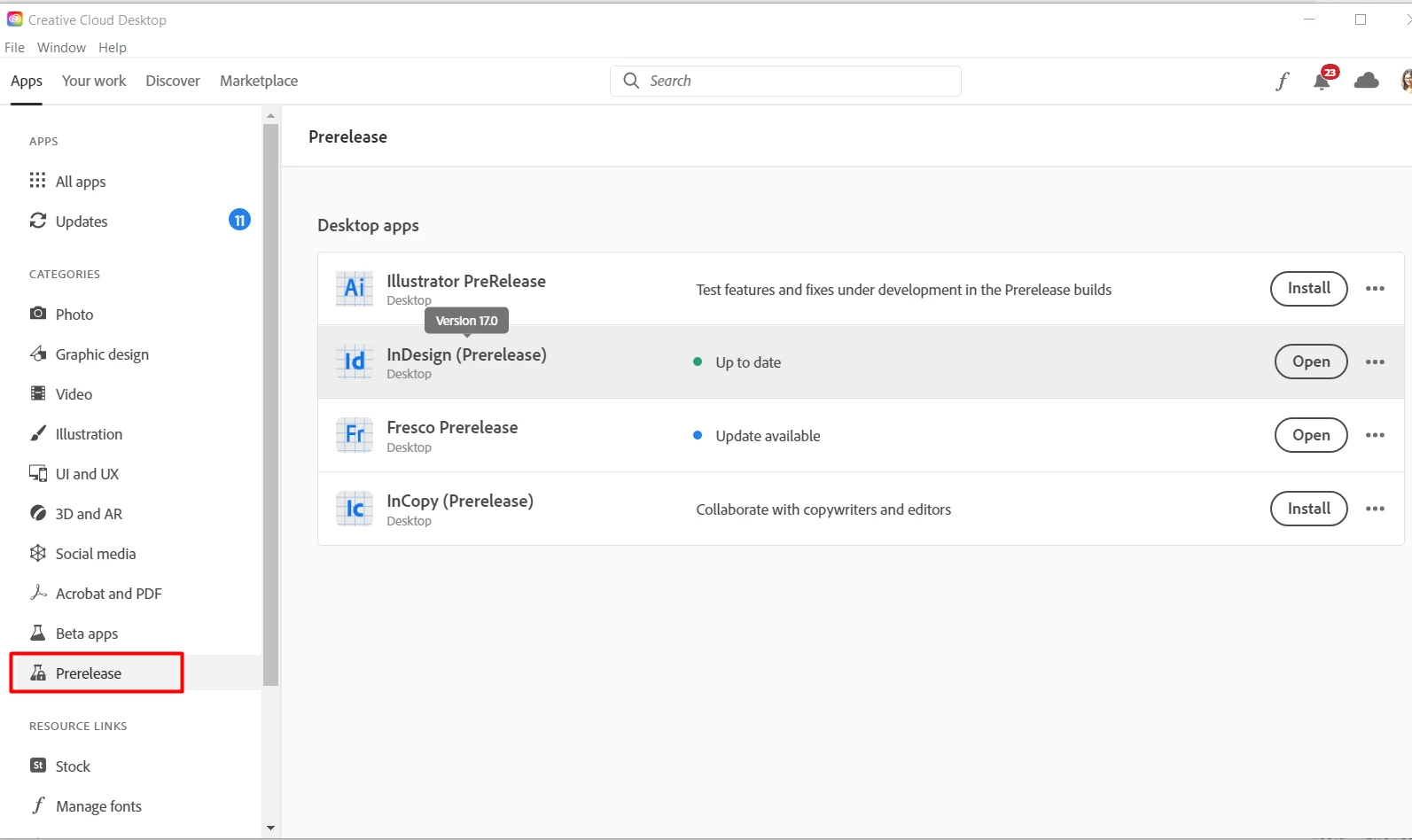 - Now you should see a new Prerelease tab in Creative Cloud. If it is still not there, please try signing out from Creative Cloud Desktop app and sign in again.