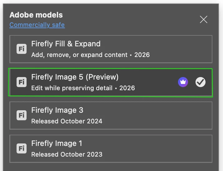3.Choose Firefly Image 5 (Preview) from the model picker in the Contextual Task Bar.