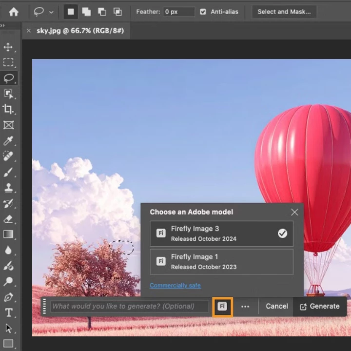 Firefly Model Selection When you use Generative Fill and Generative Expand, you can switch between multiple Firefly model versions to better match your creative goals. Whether you're aiming for more realism or adding an artistic flair, there's a Firefly model that will work for you.