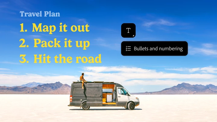 Create clear and organized lists and improve the readability of your text with the Bullets and Numbering feature support now available in Type tool.