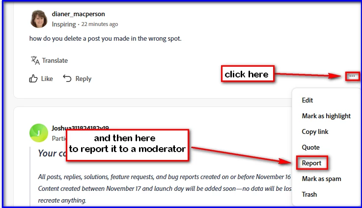 @dianer_macperson @dianer_macperson it says to use the report only for abusive language and such. I don't want to be flagged. Is there a way I can delete it myself?  we used to be able to do that.