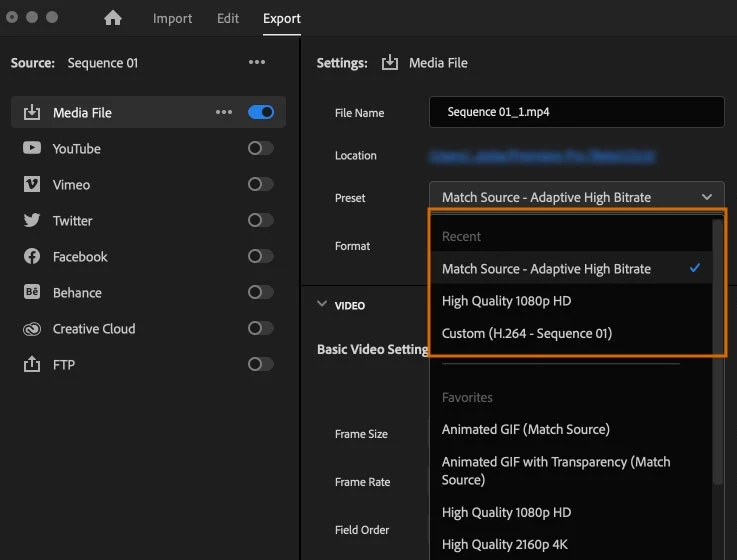The Preset menu in the Export mode now shows the last three presets you’ve exported, making it easier to quickly apply them with other sequences, clips, or projects. There's also a new keyboard shortcut you can use for reaching exports in Media Encoder more easily.