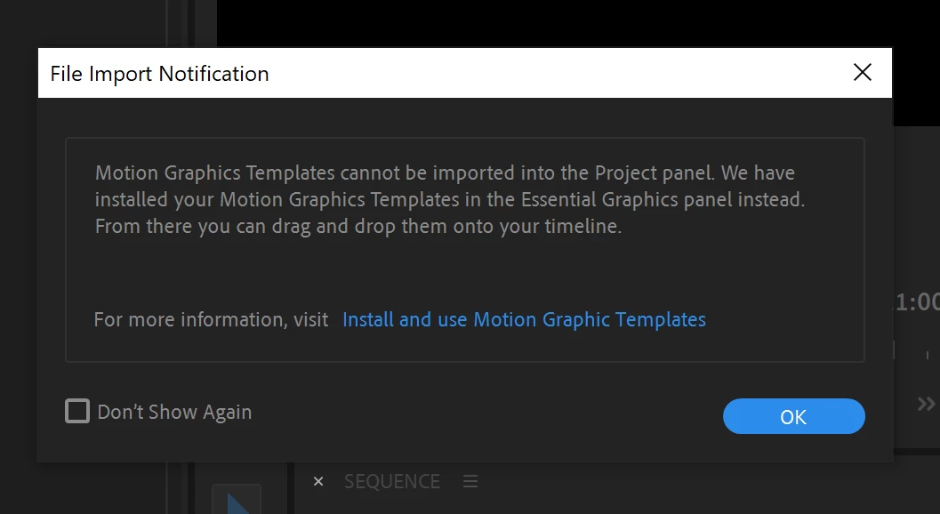 When importing Motion Graphics templates into a project, a new dialog box explains that the template will be stored under the Browse tab in the Essential Graphics panel (and not in the Project panel).