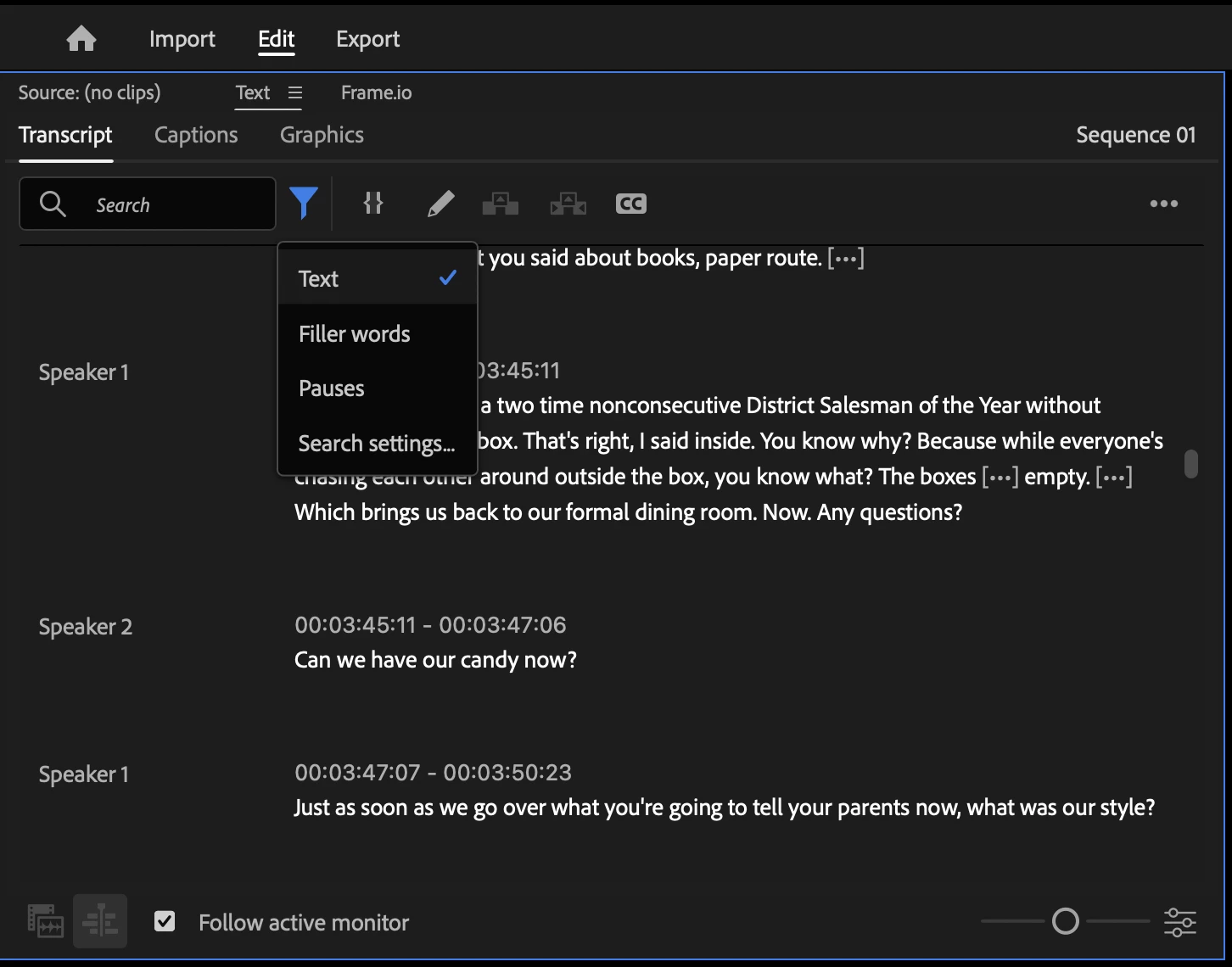 Text-Based Editing lets you detect “uh” and “umm” filler words and bulk delete them so your transcripts are more accurate. Just like with pauses, you can click on a filler word and delete it from your sequence transcript. Filler words are language agnostic so that they work in all 18 languages supported in Speech to Text.