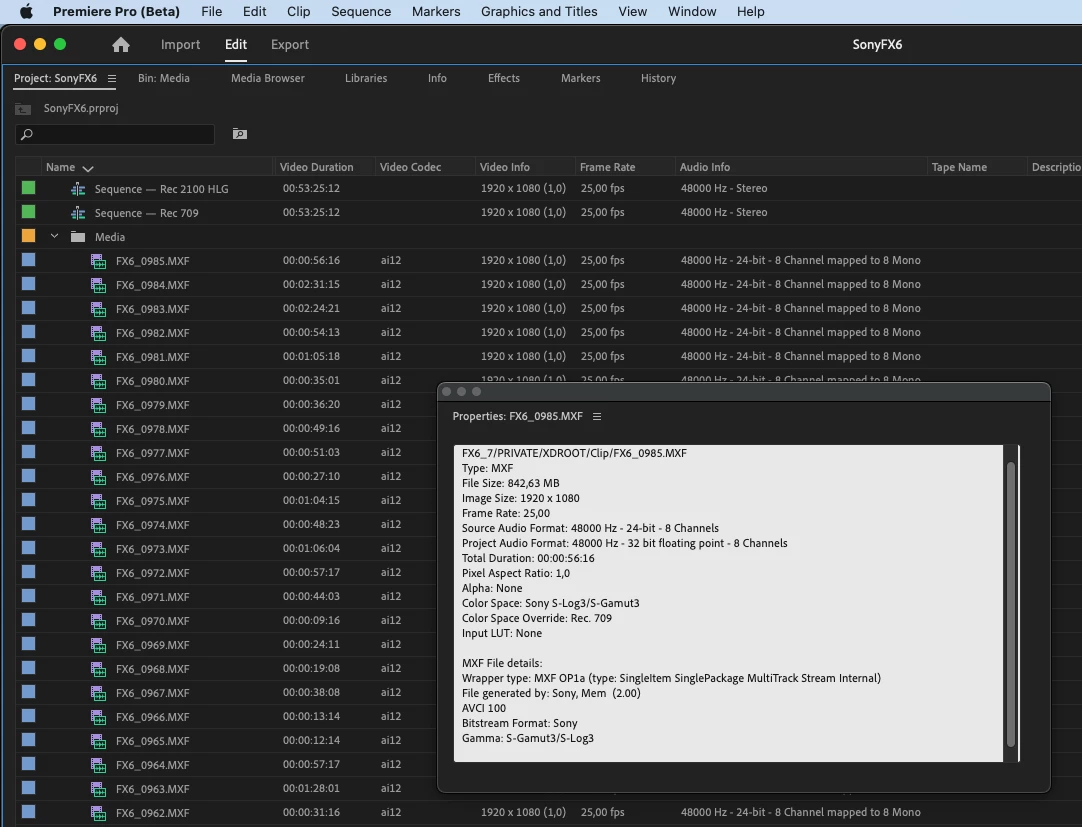 Footage is using color space overide to Slog3/SGamut 3