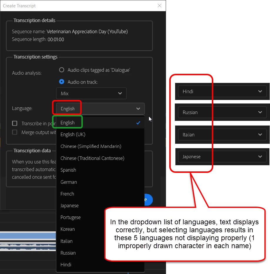 4. Text display issues in Create Transcript window: When selecting a language in the Create Transcript window, 5 of the options don't display correctly, with one of the language name's characters appearing cut off or improperly drawn.  On my system, drawing issues occur with: English (English UK works fine), Hindi, Russian, Italian and Japanese.  Oddly, these issues only appear when selecting these languages.  The drop down list of options displays all of them perfectly.