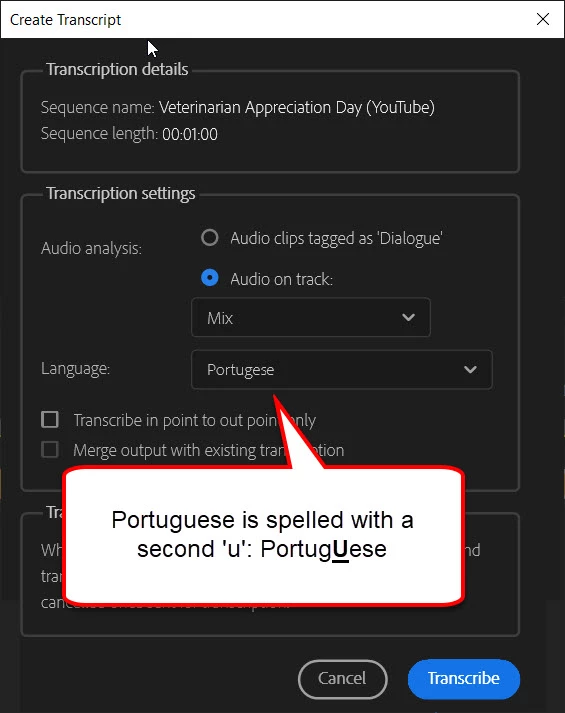 5. Portuguese with a 'u': In the Create Transcription window, Portuguese is incorrectly written without a second 'u'.