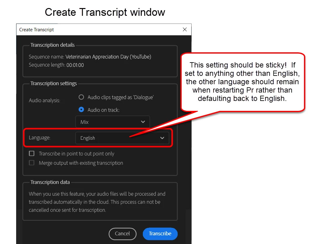 +1 for making the Create Transcript window's language setting sticky when restarting Pr.
