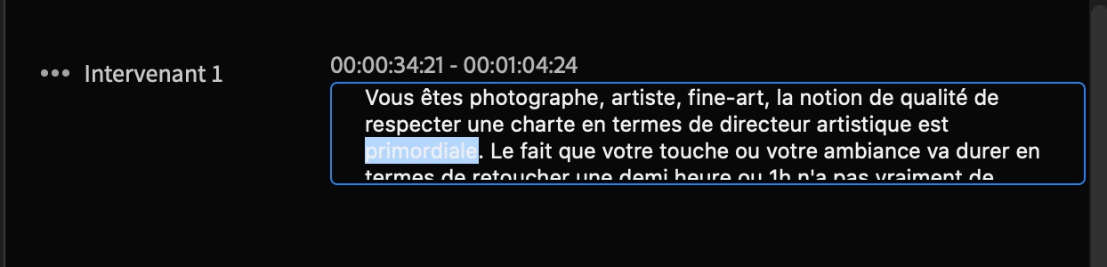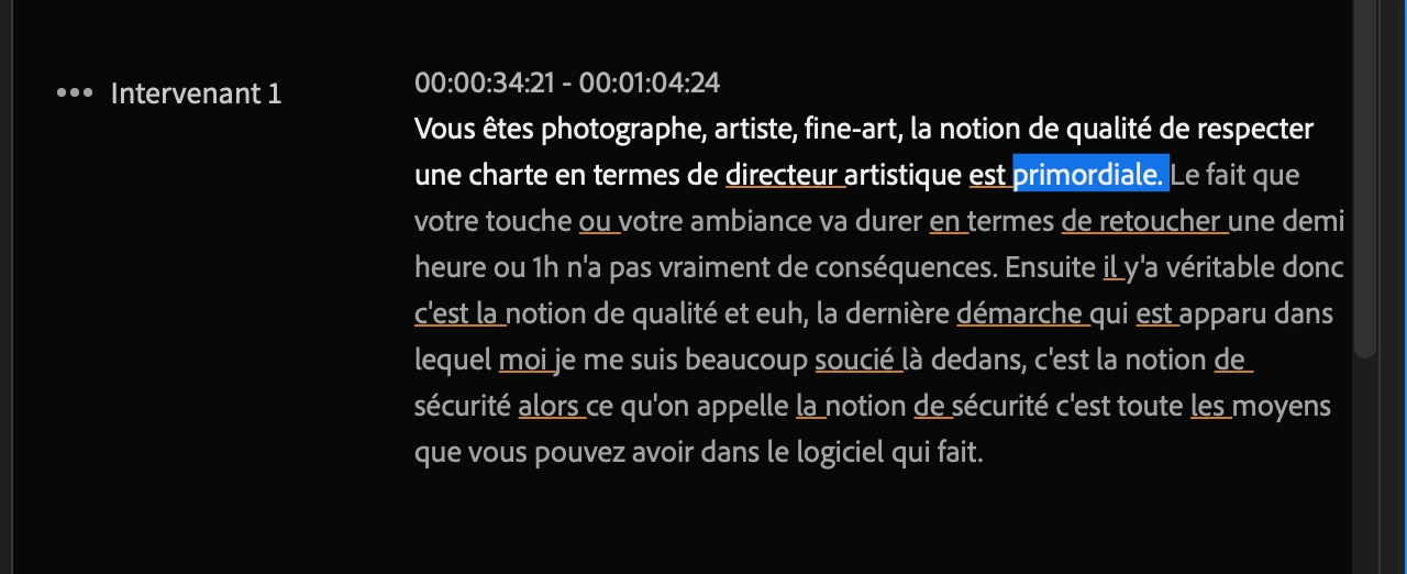 In the transcript panel, the played word is highlighted, I realize there's an edit to make, so I double click on the word :