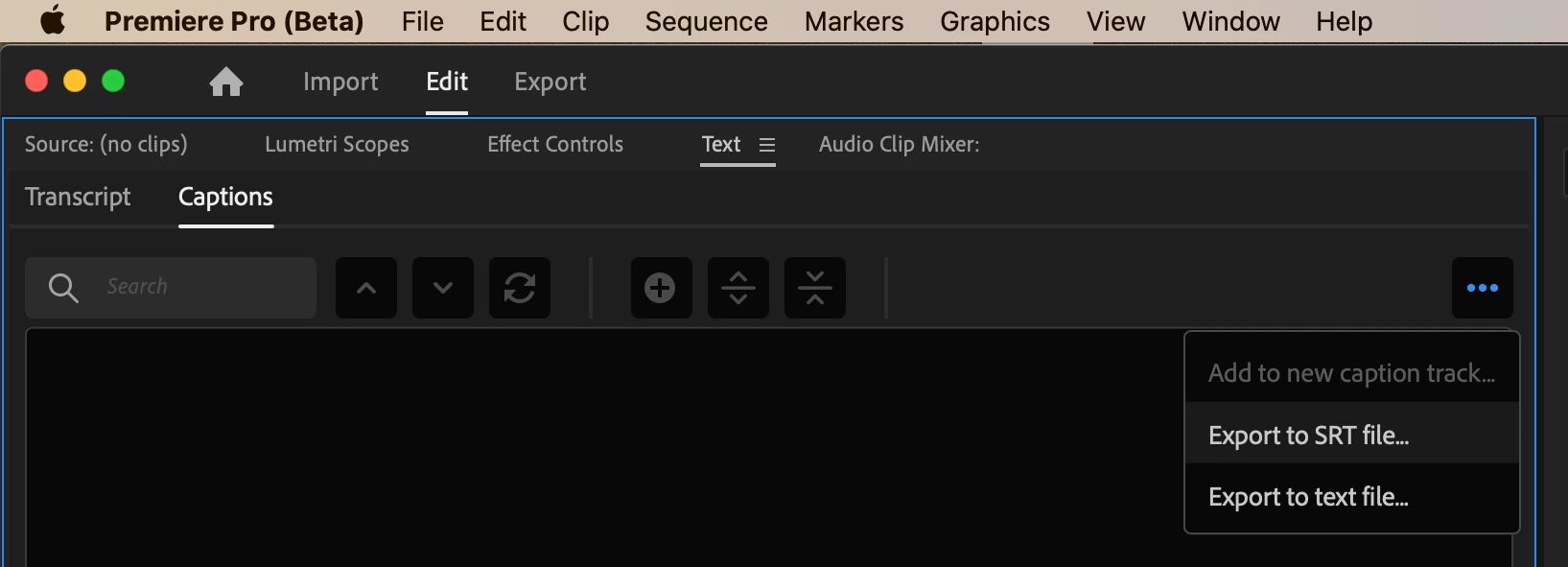 2. Open the Text panel from the window menu and make sure it’s showing the Captions tab.