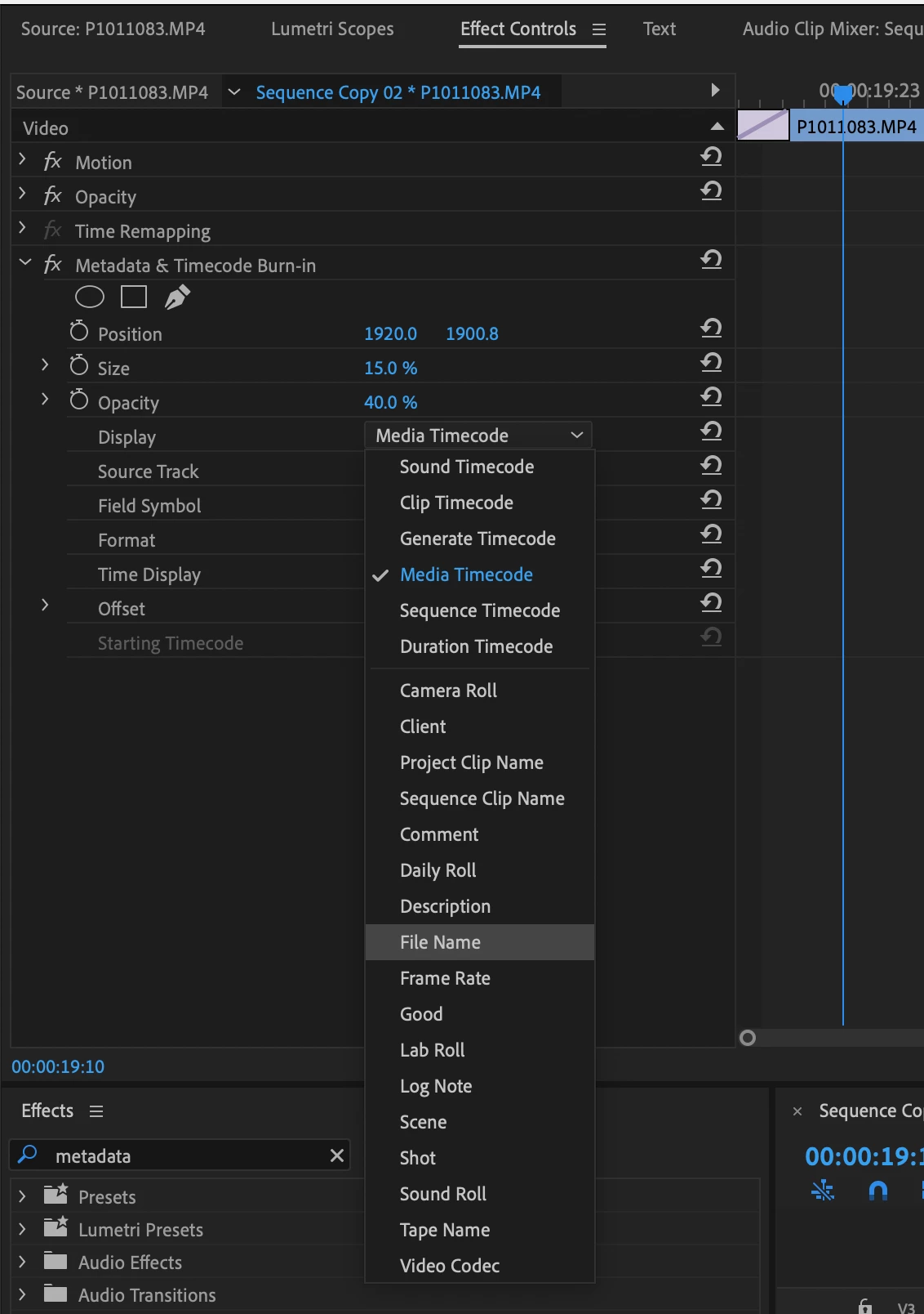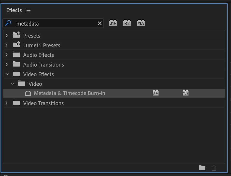 New in Premiere Pro Beta 15.2, the Metadata & Timecode Burn-in effect replaces the existing Clip Name and Timecode effects. This new effect takes advantage of our modern graphics engine and GPU acceleration for smooth playback while also offering an array of new types of metadata that you can burn into your video whether you need a simple watermark, timecode burn-in, or detailed attributes for high-end VFX workflows.